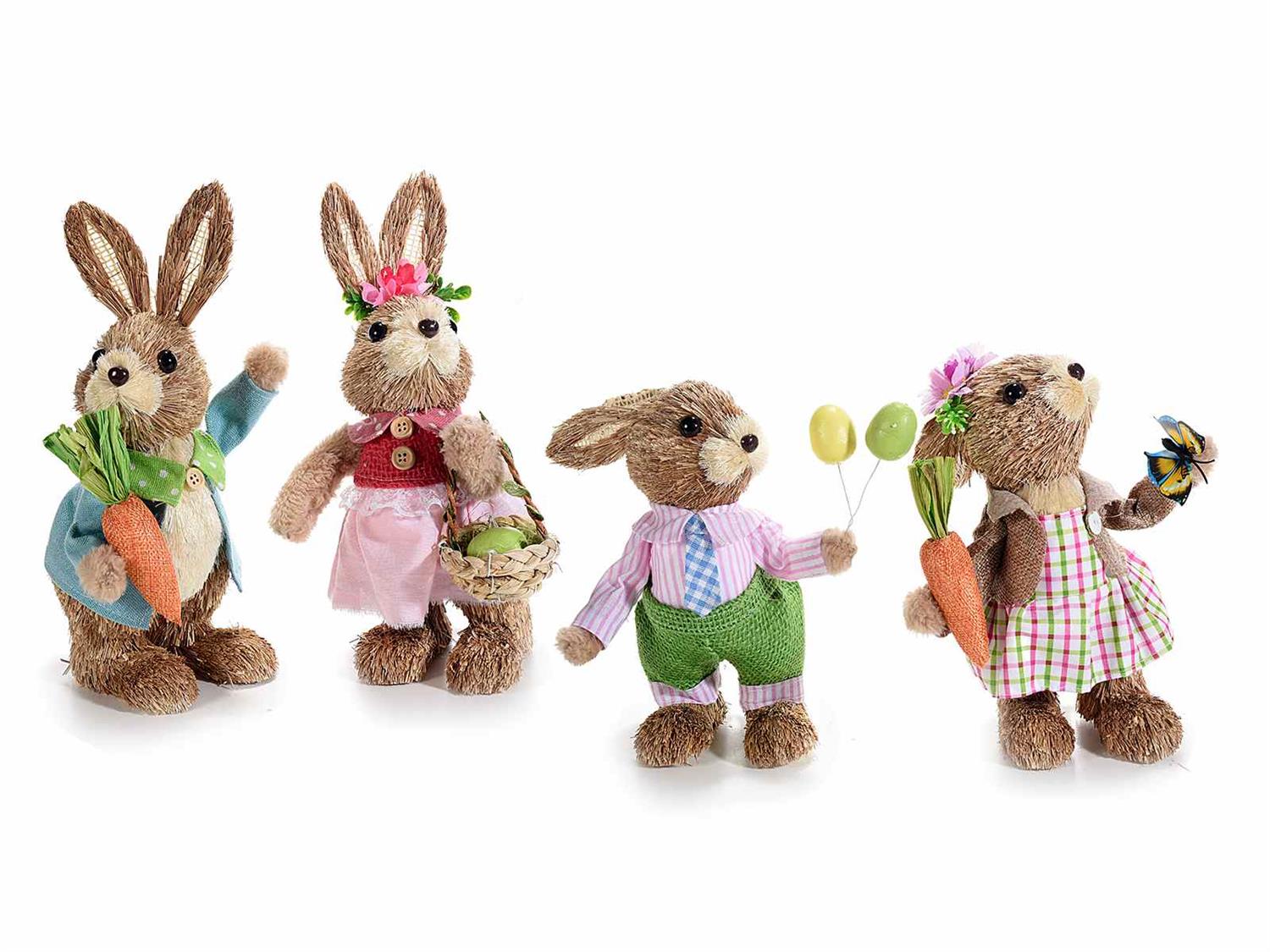Denne sjarmerende påskekaninen mannen med klær kommer fra Art from Italy og er hele 24 cm høy med formbare armer og ører. Den har herlige fargerike klær og er i naturlig fiber. Det er mannen med gulrot til venstre i bildet.