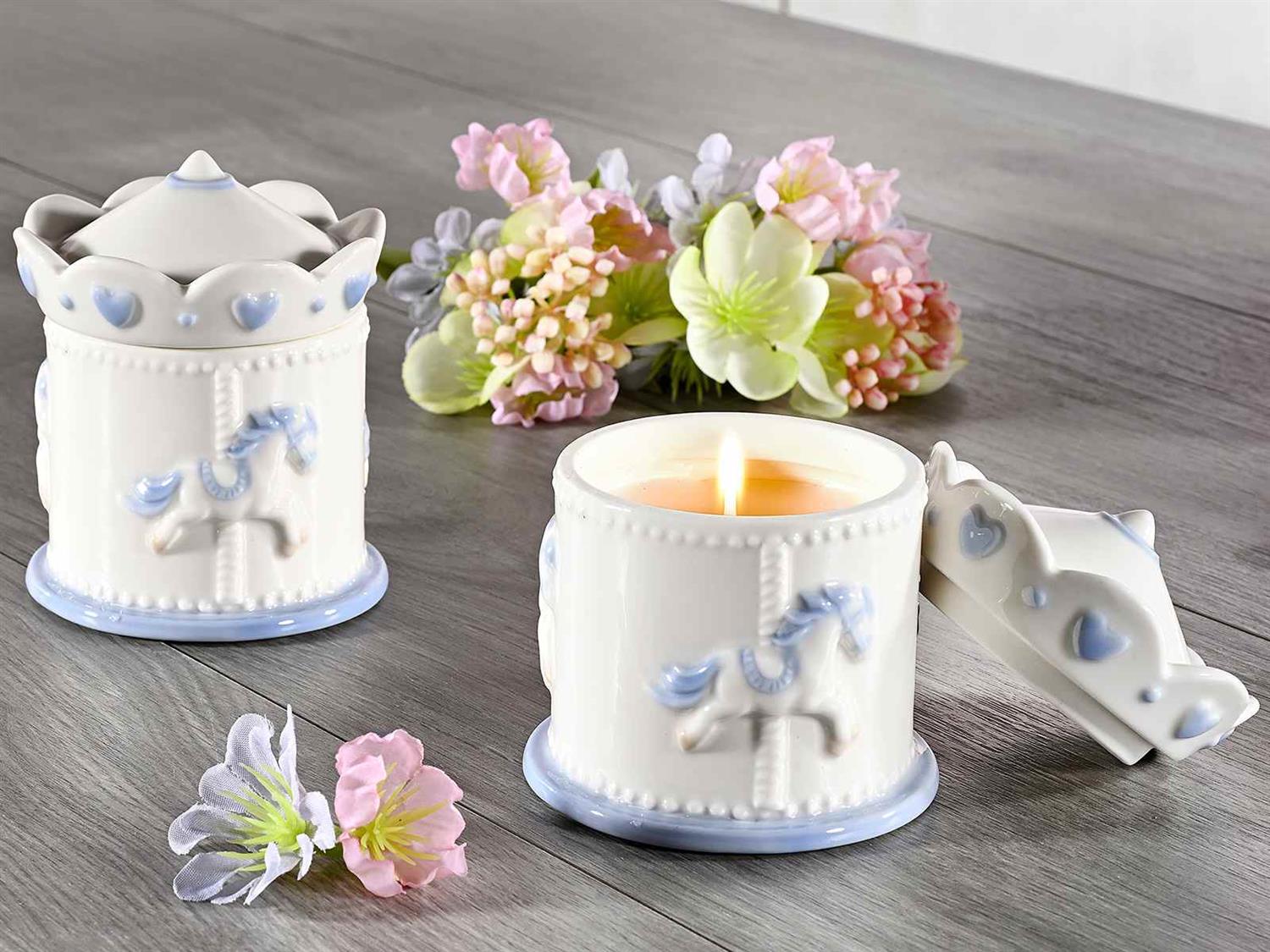 Vakkert og nostalgisk duftlys med behagelig lukt av vanilje fra Italia. Duftlyset er i elegant porselen med lokk og har motiv av gammeldags karusell i lyseblått.