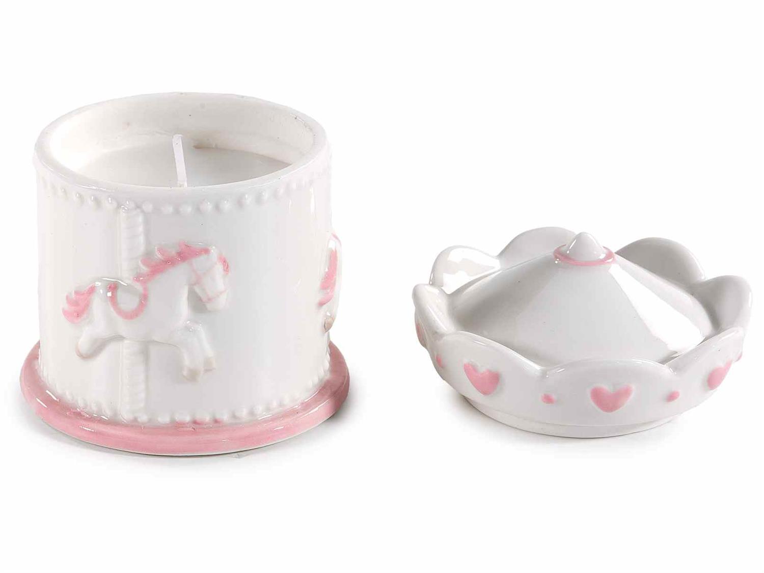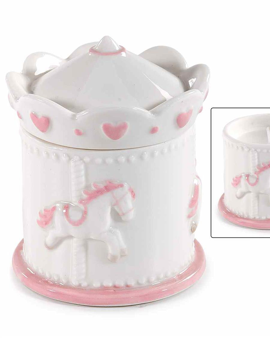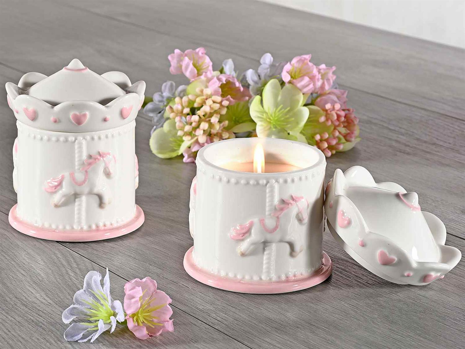 Vakkert og nostalgisk duftlys med behagelig lukt av vanilje fra Italia. Duftlyset er i elegant porselen med lokk og har motiv av gammeldags karusell i lyseblått.
