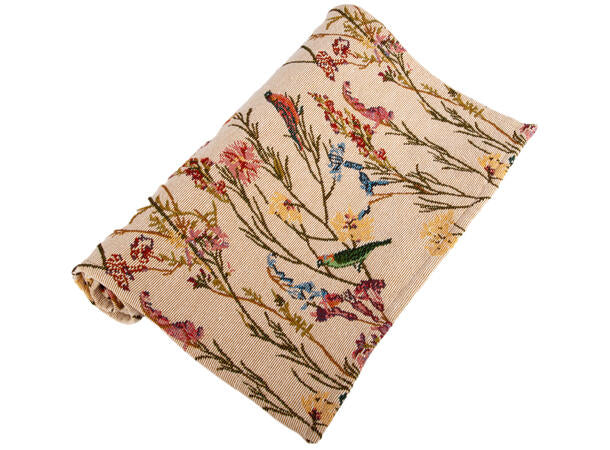 Flott løpet i jaquard med blomster og fugl i krem. Løperen er 33x100 cm og er 40 % bomull og 60 % polyester.