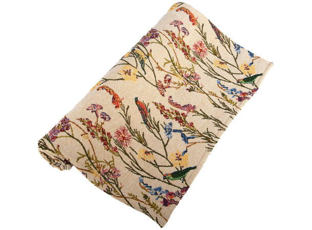 Flott løpet i jaquard med blomster og fugl i krem farge. Løperen er 40x140 cm og er 40 % bomull og 60 % polyester.