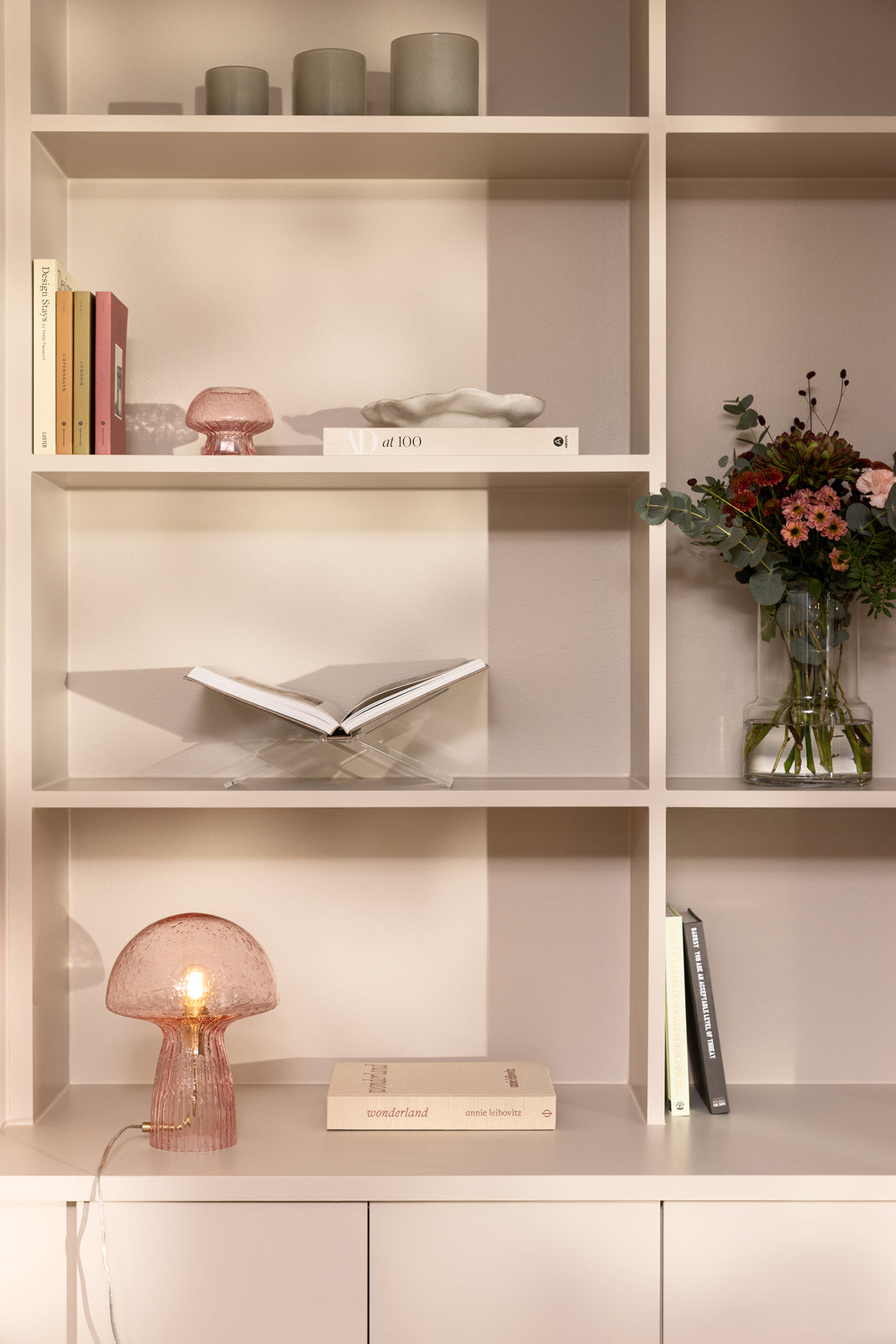 Inspirert av skogen kommer denne lille bordlampen avbildet som en sopp. Den er laget av rosa glass med rifler på foten der riflene går helt opp under hatten som skivene på en agarikksopp.