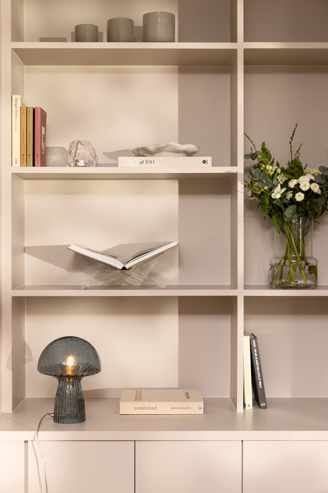 Lampen har mange flotte små luftbobler i glasset som gir en koselig stemning når lyset er på. Fungo Special Edition 22 er en mellomstor bordlampe som passer perfekt i vinduet, på en skjenk eller en hylle.