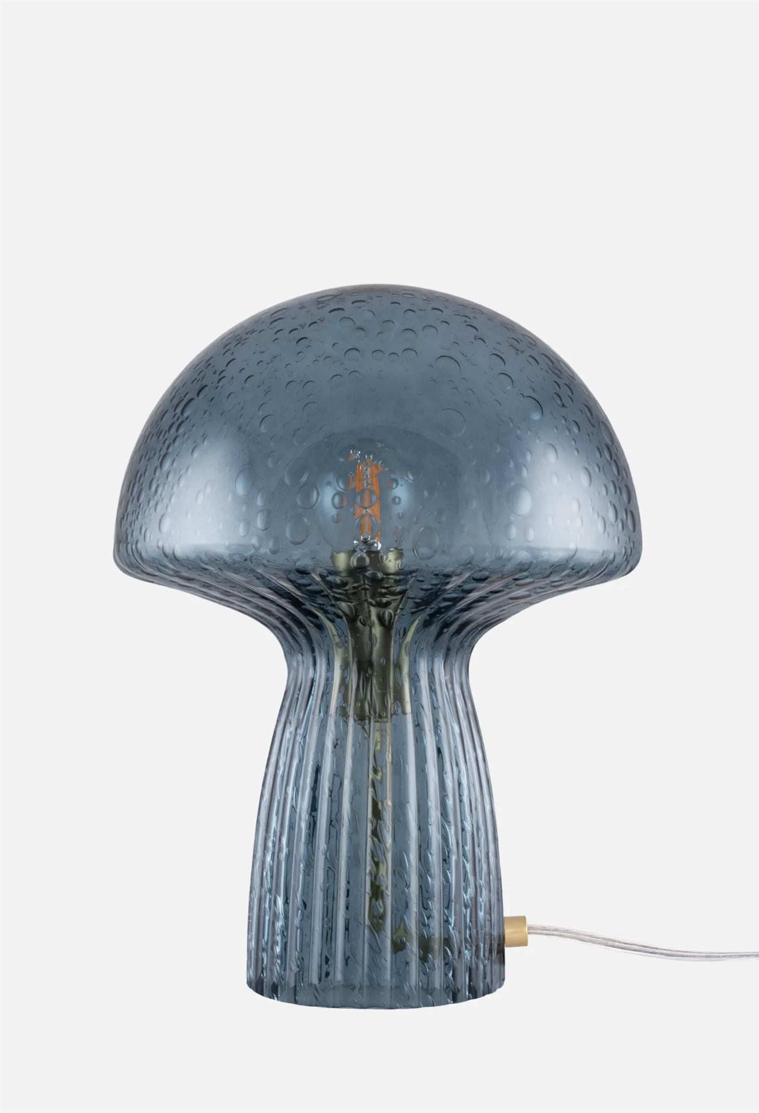 Inspirert av skogen kommer denne lille bordlampen avbildet som en sopp. Den er laget av røyktblått glass med rifler på foten der riflene går helt opp under hatten som skivene på en agarikksopp.