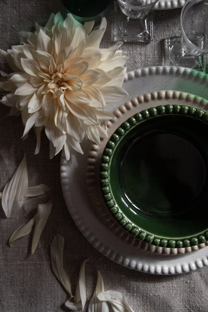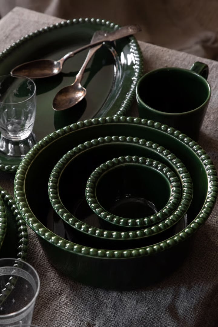 Lekker skål Daria Moss fra PotteryJo som er håndlaget i Portugal av ovnsikkert steintøy. Skålen er i lekker grønn farge med vakker mønsterkant.