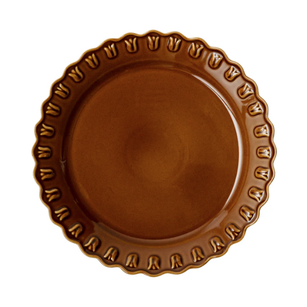 Den vakre tallerken Tulipa Umbra fra PotteryJo er håndlaget i Portugal av ovnsikkert steintøy. Tallerken er i lekker brun farge med vakker mønsterkant.