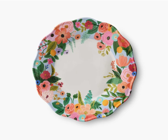 Sett med 4 middagstallerkener i Garden Party mønster med en ulike farger under mønsteret.