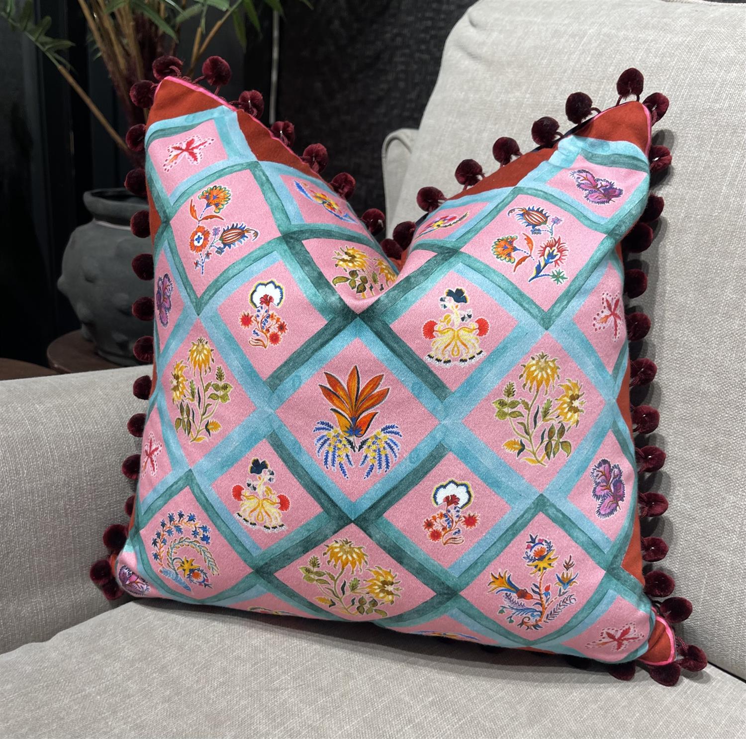 Forny sofaen og gi den et løft med den fantastiske puten Lucia red fra Eleni Malami! En leken kombinasjon av sterke farger og vakre botaniske mønstre gir et friskt og gledelig uttrykk.