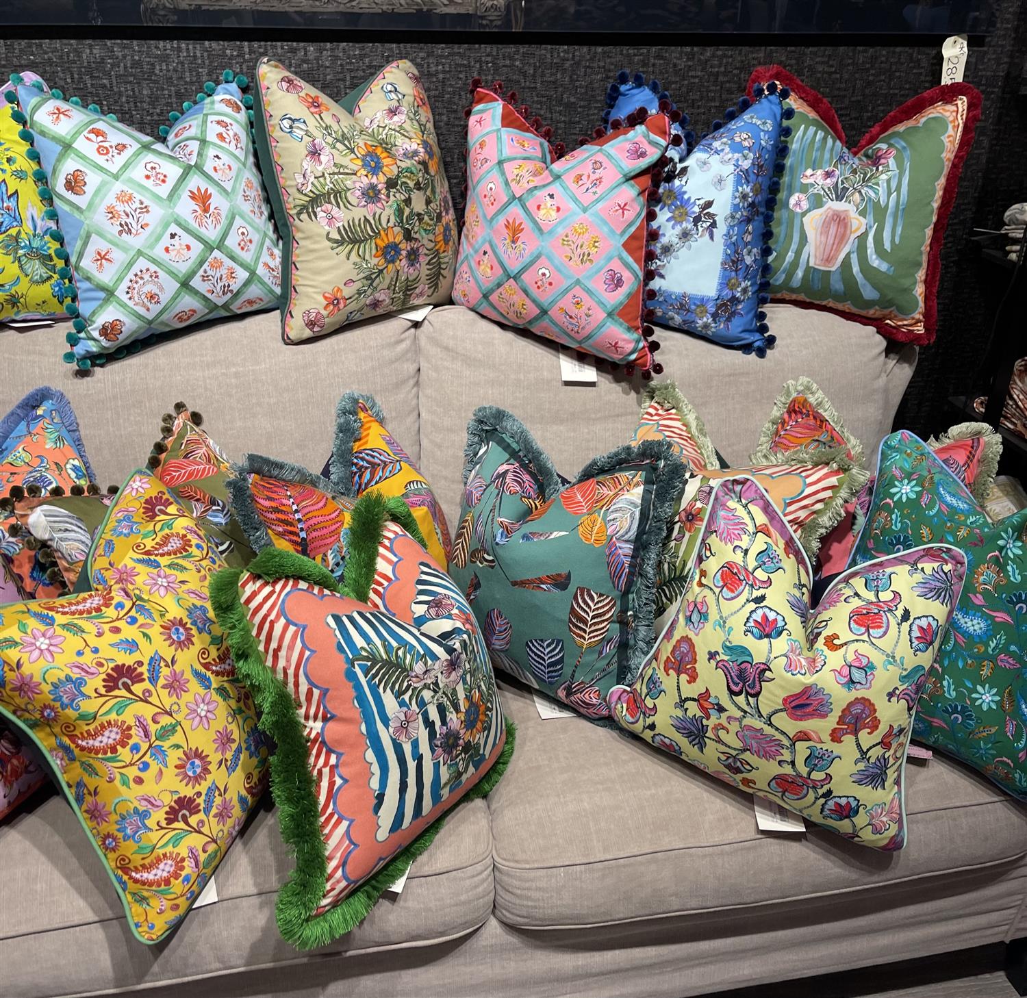Den er trykt på myk bomullssateng med en baksiden i bomullstwill, og pyntet med sjarmerende dusker. Den strålende fargepaletten gir et friskt løft til en favorittstol, sofa eller seng.