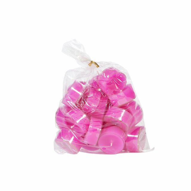 20 stk cerise rosa telys i pose. Plastkopp er gjennomsiktig så fargen på lyset sees. Brennetiden er 4 timer.