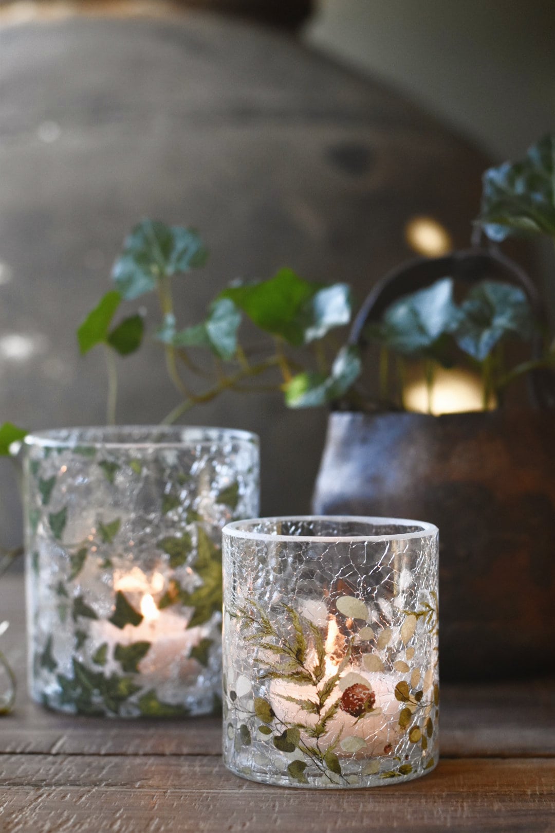 Vakkert lysglass med retro eføy fra Trend Design i krakelert glass. Lysglasset er 11,5x13 cm - det er til høyre i bildet.