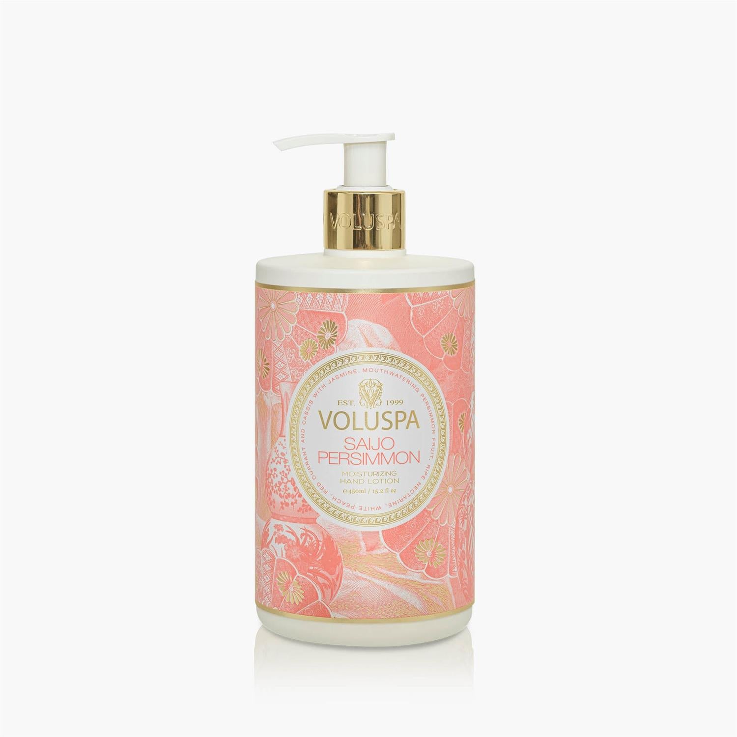 Delikat håndkrem fra Voluspa i lekker flaske som er elegant på kjøkkenet eller badet. Håndkremen har duft av persimon, nektarin, fersken, rips, solbær og hvit sjasmin.