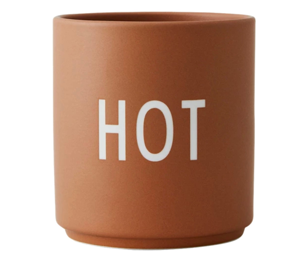 Moderne Arne Jacobsen porselenskopp i benporselen fra Design Letters med teksten HOT. Typografi designet av Arne Jacobsen.