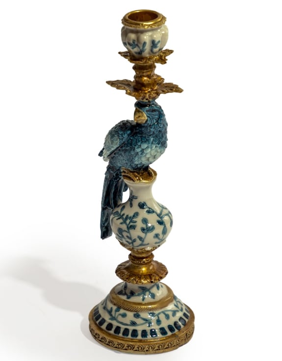 Den populære lysestaken i blå og hvit med papegøye har kommet inn i lekker variant på 28 cm. Den tilfører en touch av natur og en varm atmosfære til interiøret ditt. Lysestaken er i polyresin.