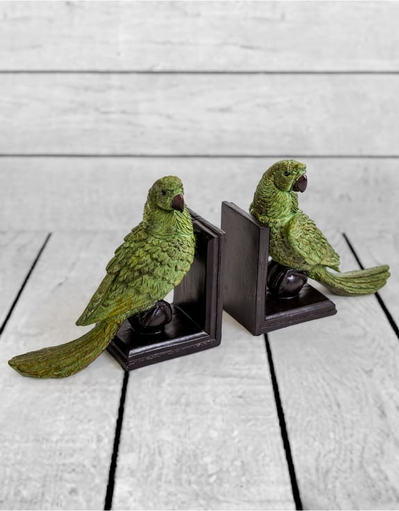 Herlige og eksotiske bokstøtter med grønne papegøyer i sett med 2 stk fra vår leverandør i England.