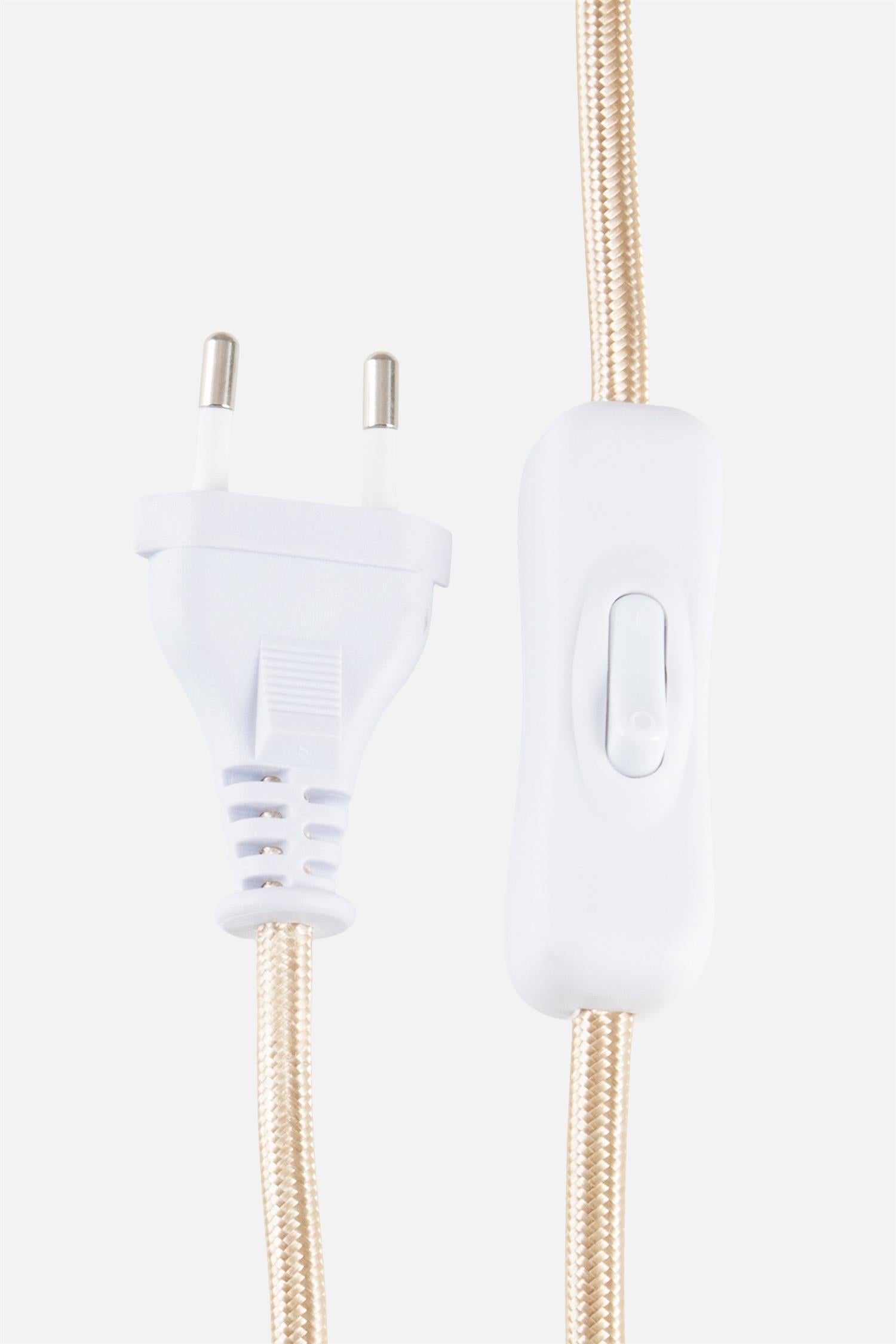 Den har en 2 meter lang beige tekstilkabel med en perlemoraktig glans komplett med bryter og støpsel.