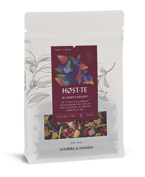 Blåbæryoghurt fra Solberg & Hansen er en frukt te med en fyldig og blåbærsøt fruktblanding med smak av vaniljeyoghurt og høstens sødmefulle bær.