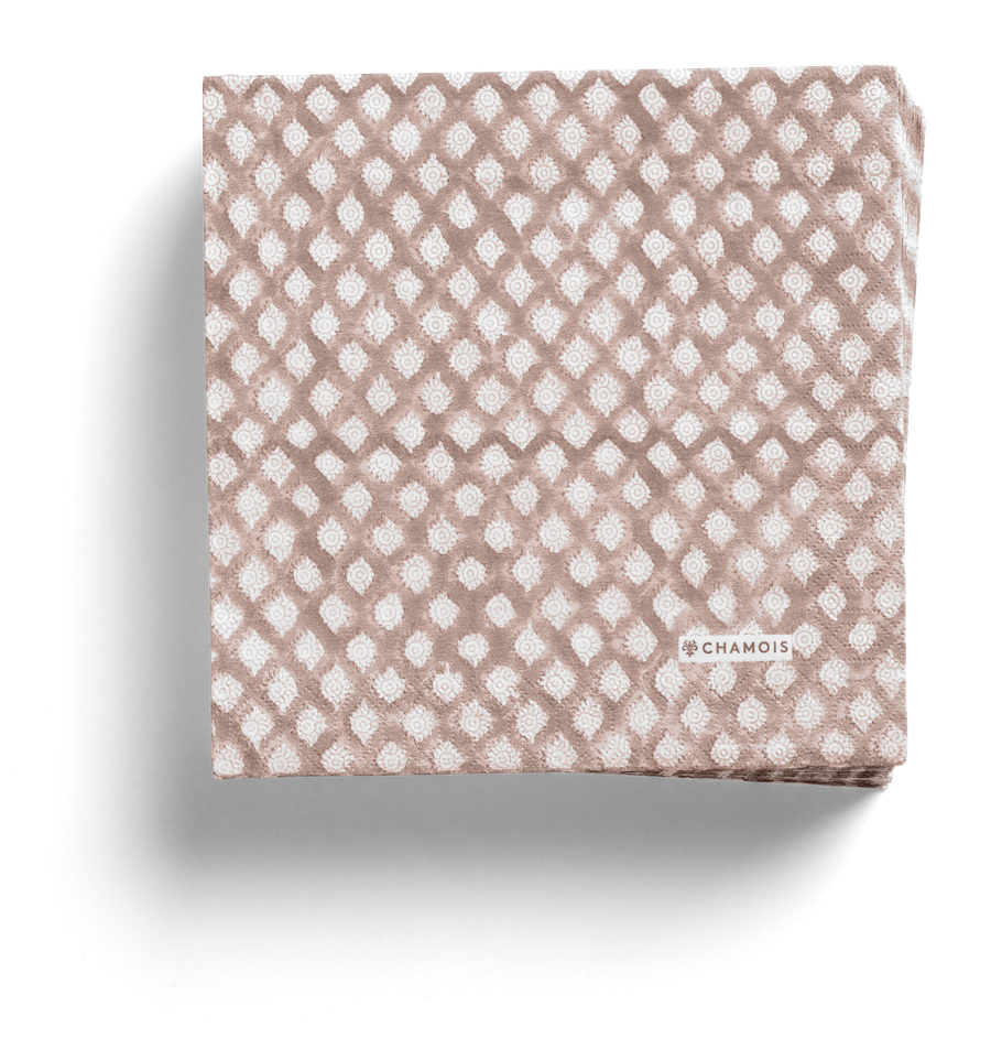 Papirservietter med Chamois sitt populære Medallion mønster. Perfekt til både hverdag og fest. Den nydelige rosa fargen gir bordet et friskt preg. Én pakke inneholder 50 servietter.
