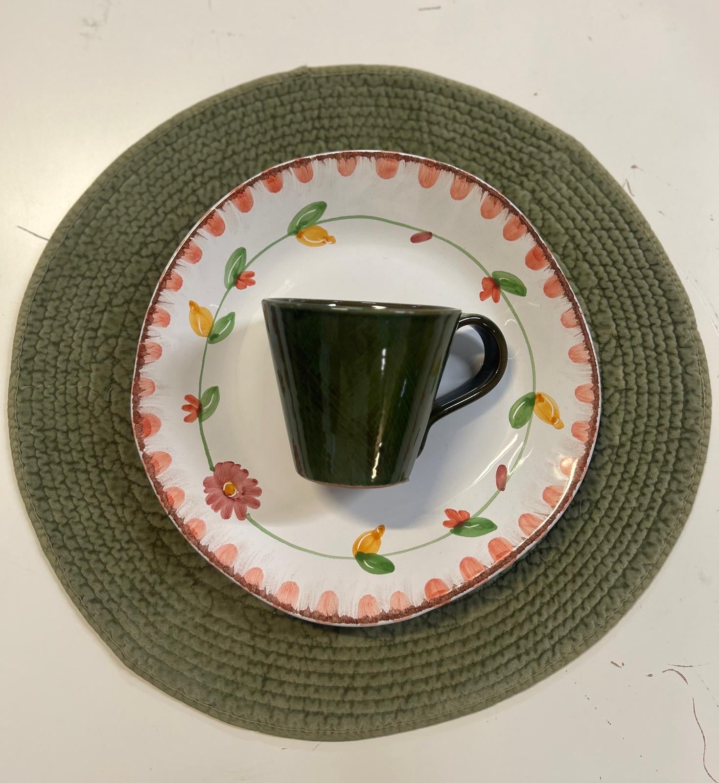 Flotte rund velour spisebrikker i olivo fra Anouska. Spisebrikkene passer like fint hjemme som på hytta og gjør seg når du skal dekke et hyggelig bord. Spisebrikkene er perfekt til hverdag og fest!