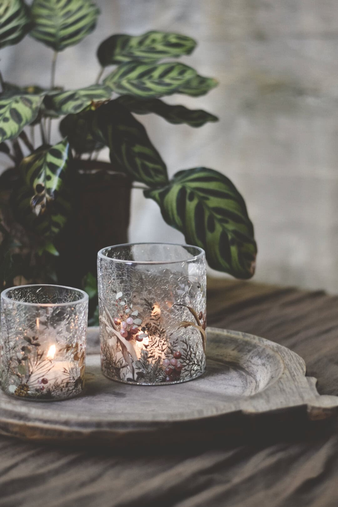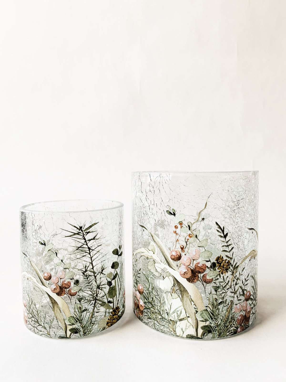 Vakkert lysglass med naturmotiv med bær og blader fra Trend Design i krakelert glass. Lysglasset er 9x10 cm og er til venstre i bildet.