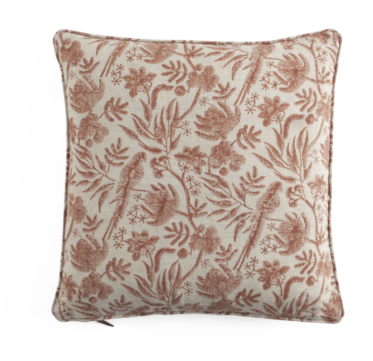Det vakre putetrekket Parrot Open fra Chamois har håndtrykte mønsteret i en nydelig rust farge. Hver pute er laget med tradisjonell treblokktrykk teknikk som er et tidkrevende håndverk som gir hvert pute sitt unike preg. Den er sydd i lin av høy kvalitet, med en solid glidelås og en liten lærdetalj som setter prikken over i-en.