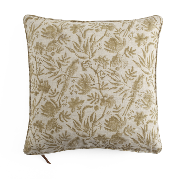 Det vakre putetrekket Parrot Open fra Chamois har håndtrykte mønsteret i en nydelig oker farge. Hver pute er laget med tradisjonell treblokktrykk teknikk som er et tidkrevende håndverk som gir hvert pute sitt unike preg. Den er sydd i lin av høy kvalitet, med en solid glidelås og en liten lærdetalj som setter prikken over i-en.