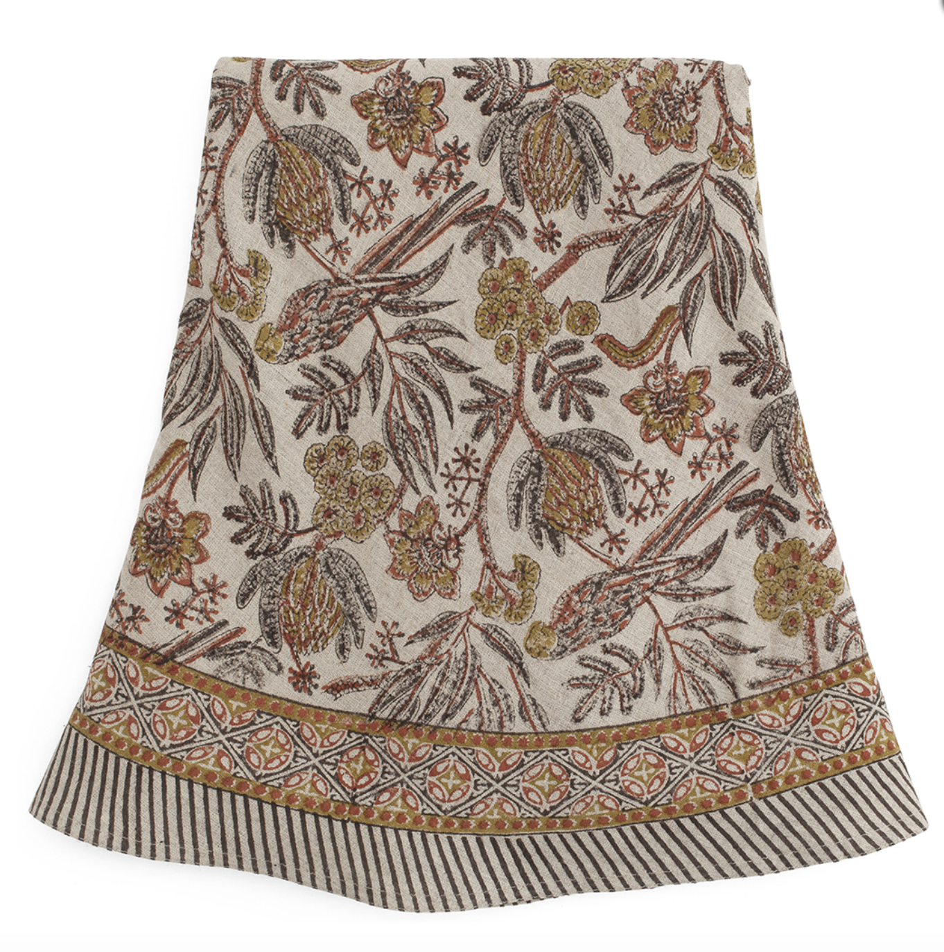 Den er laget i ubleket lin med en tradisjonell håndtrykk-teknikk som gir et unikt og levende uttrykk. Den faller tungt og naturlig over bordet, med fine detaljer i både mønster og tekstur.