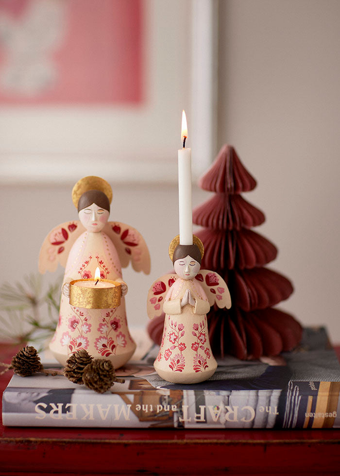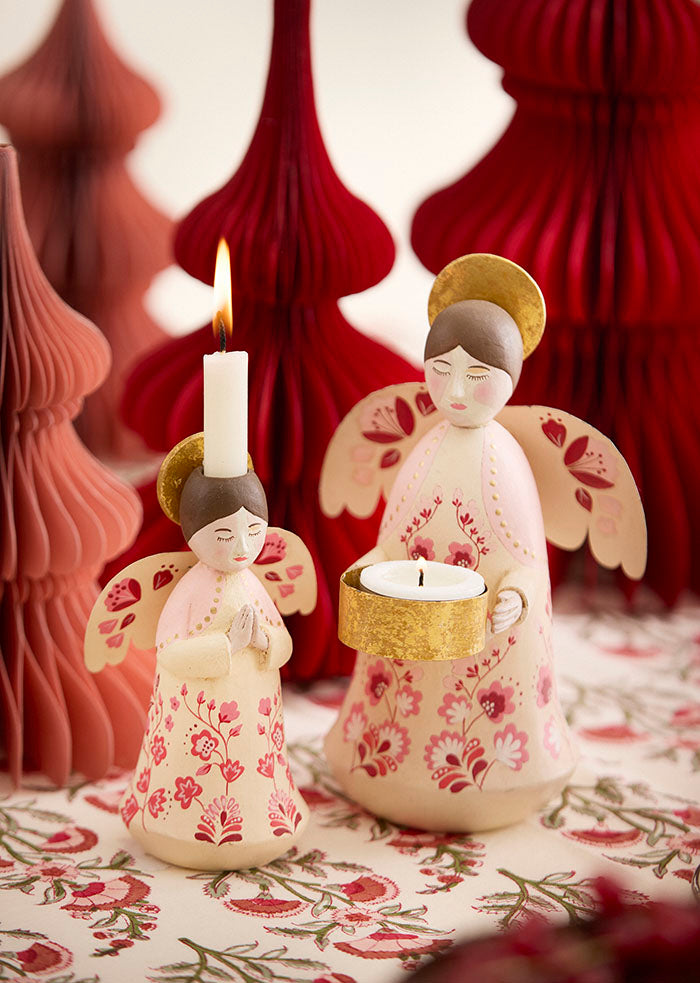 Sjarmerende lysestake med engledesign og intrikate håndmalte detaljer i Marigold Ruby fra Bungalow.