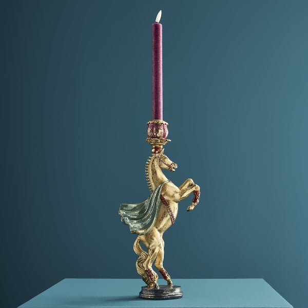 Den flotte hesten er portrettert som en sirkus lysestake. Dette unike lysestaken er i gull med røde og grønne detaljer og kommer fra Werner Voss/Werns.