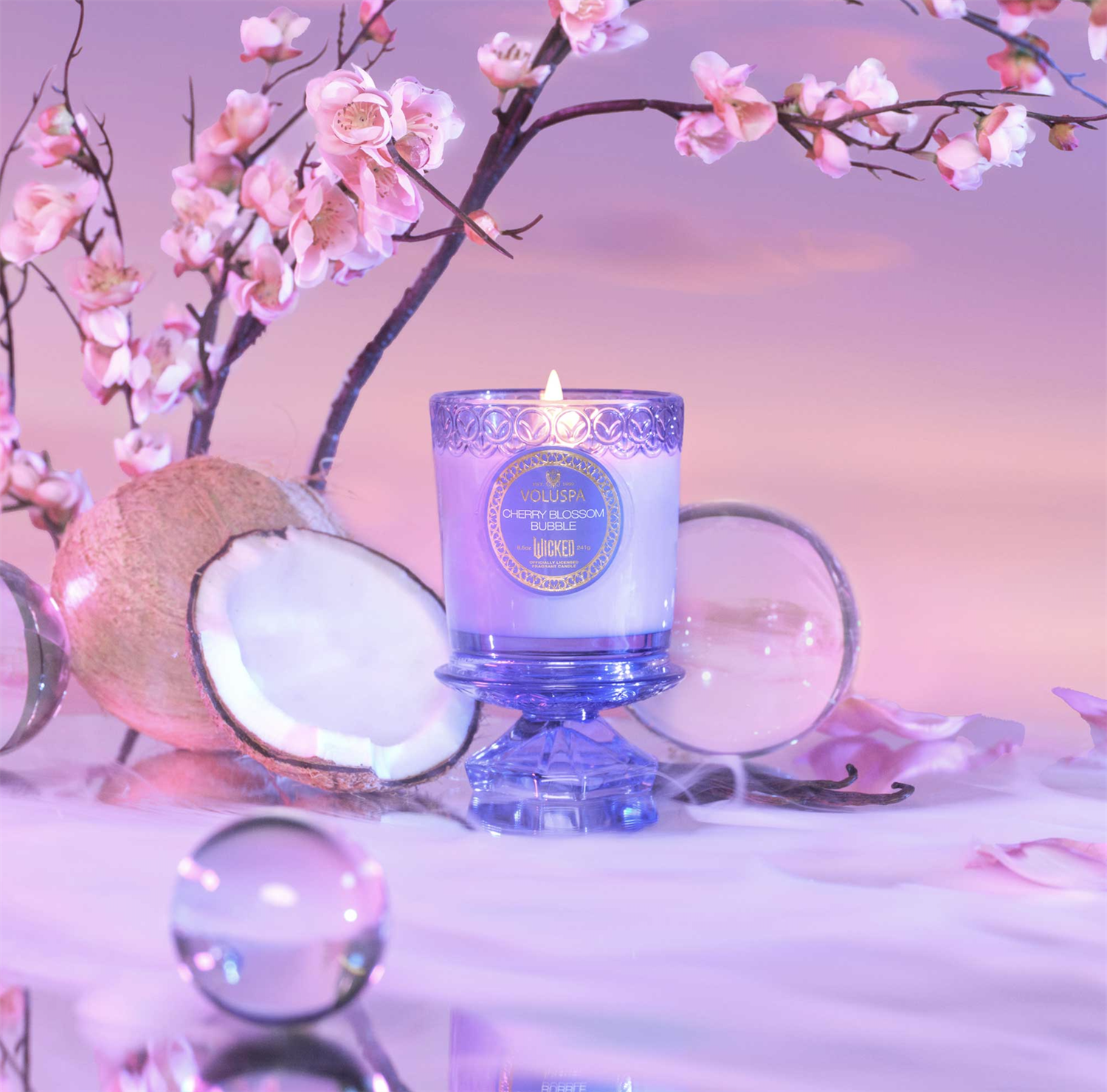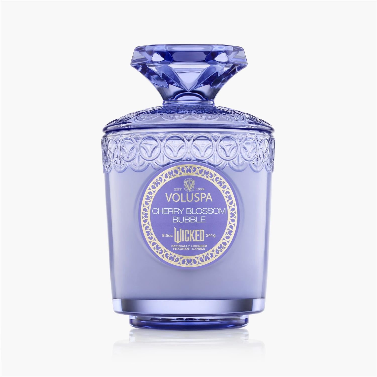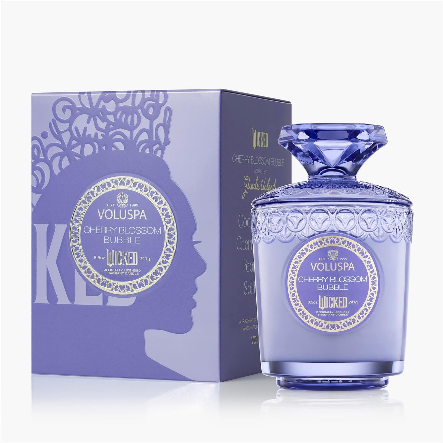 Det delikate duftlyset Cherry Blossom Bubble fra Voluspa er en limited edition serie inspirert av Wicked. Det vakre duftlyset har en unik iriserende glans og kommer i en delikat krukke med et edelstensformet glasslokk som også kan brukes som en pidestall.