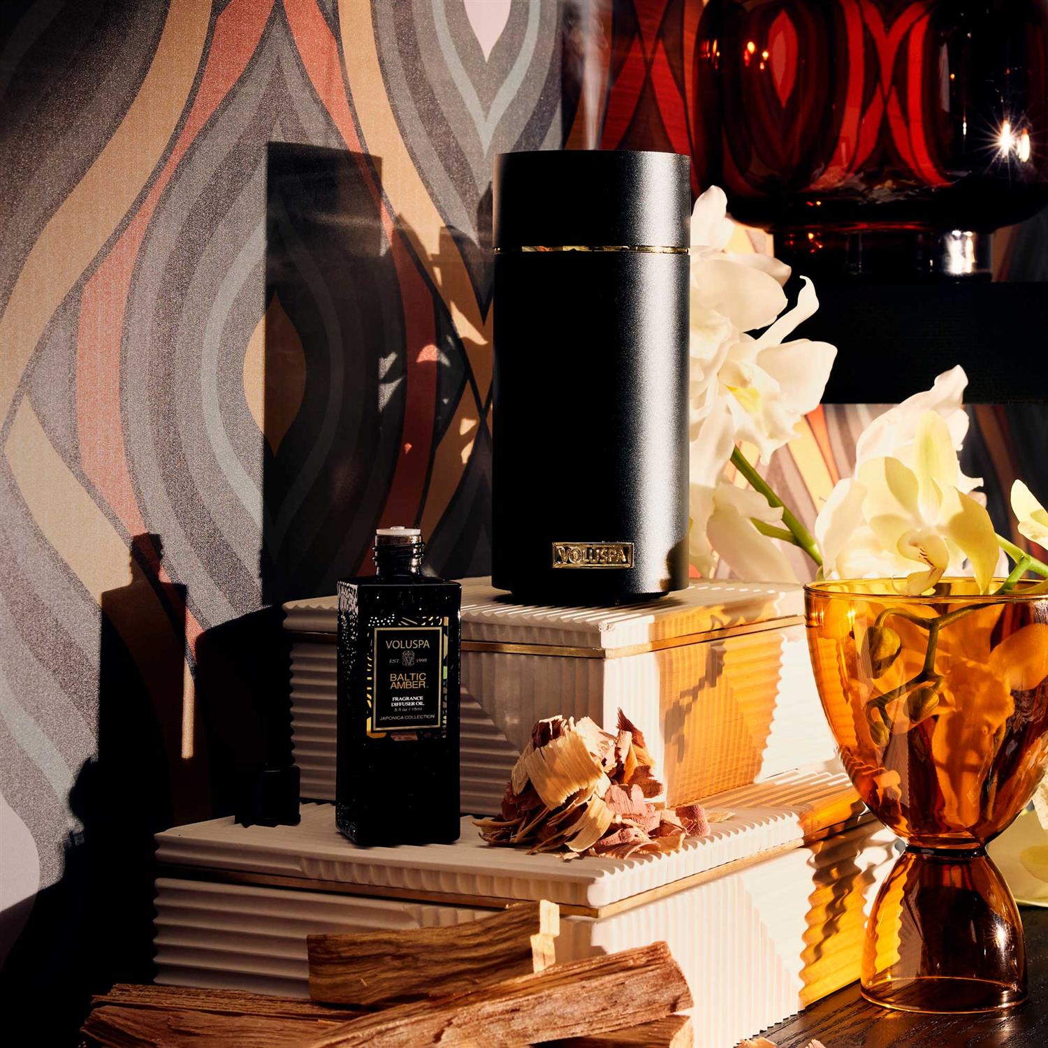 Ultrasonic Diffuser Oil i Baltic Amber fra Voluspa er en duftolje med en duft av gyllen rav, myke tretoner og den rike duften av vaniljeorkidé. Oljen kommer i lekker og dekorativ flaske og hører sammen med Ultrasonic Diffuser Device som er en elektronisk diffuser fra Voluspa.