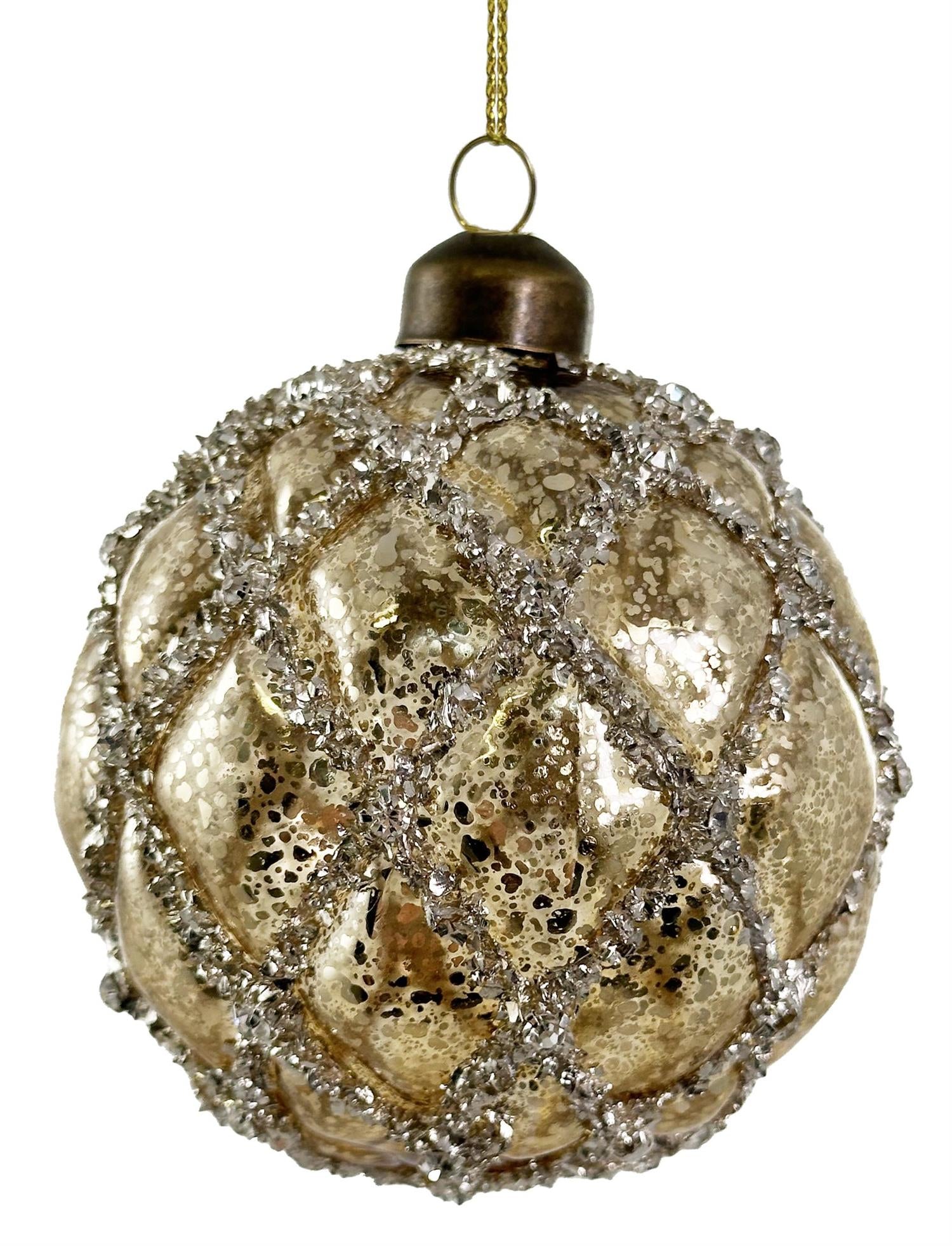 Lekker juletrepynt med julekule i antikk gull fra Shishi på 8 cm. Julekuler er i glass med gull glitter og «diamanter».