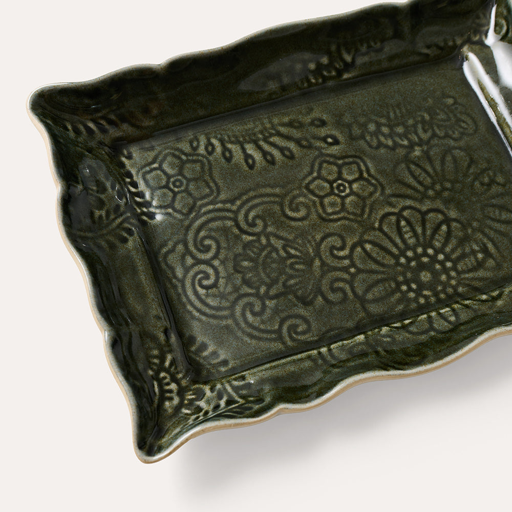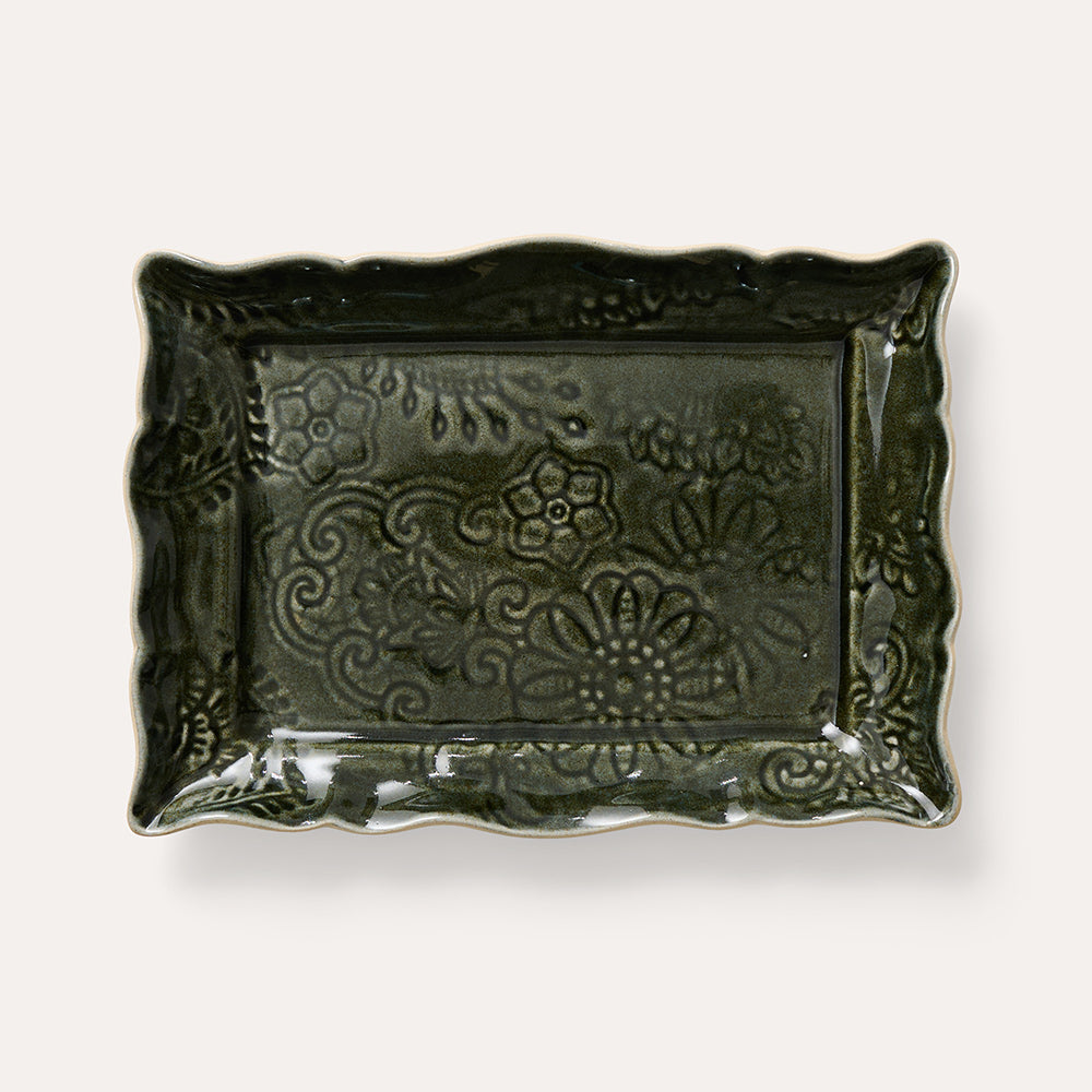 Den vakre asjetten Appetizer i nyheten Shadow på 19x13 cm kommer fra Sthål vakre serie Arabesque. Den nye fargen Shadow er en mørk mosegrønn farge som er litt grå og som er lekker i kombinasjon med andre farger fra Sthål.