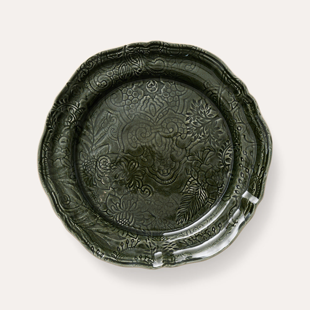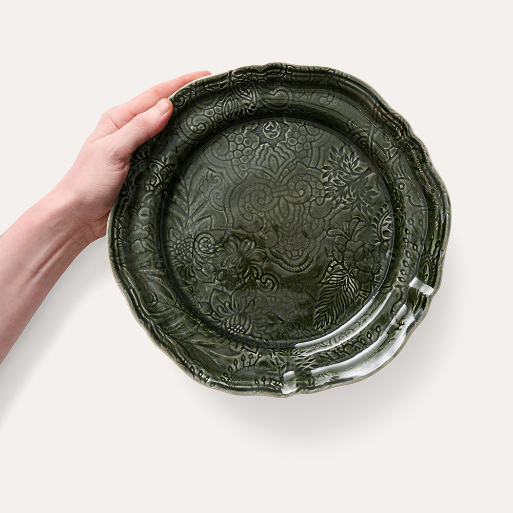 Den vakre tallerken Dinner Plate i den nye fargen Shadow på 28 cm kommer fra Sthål vakre serie Arabesque. Den nye fargen Shadow er en mørk mosegrønn farge som er litt grå og som er lekker i kombinasjon med andre farger fra Sthål.