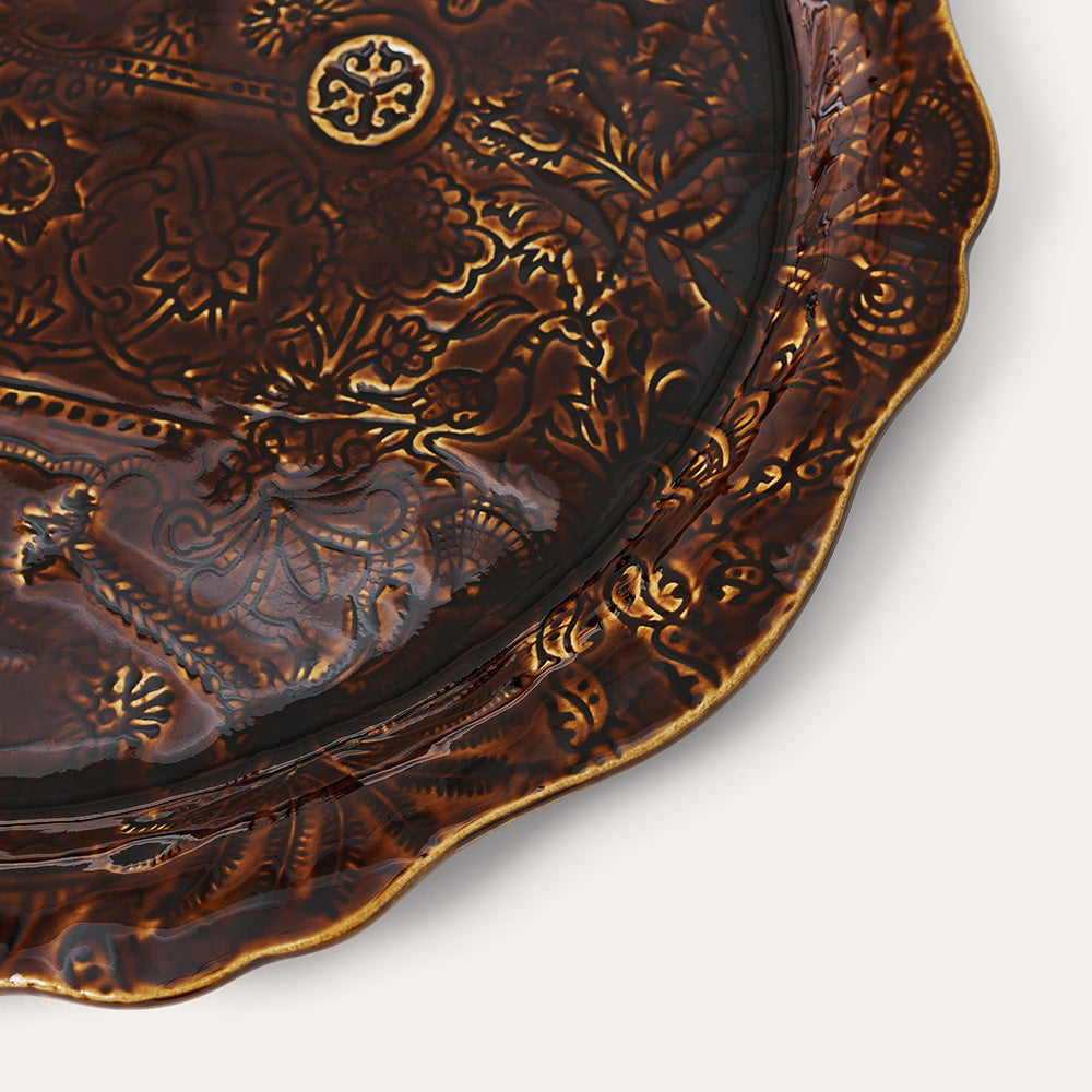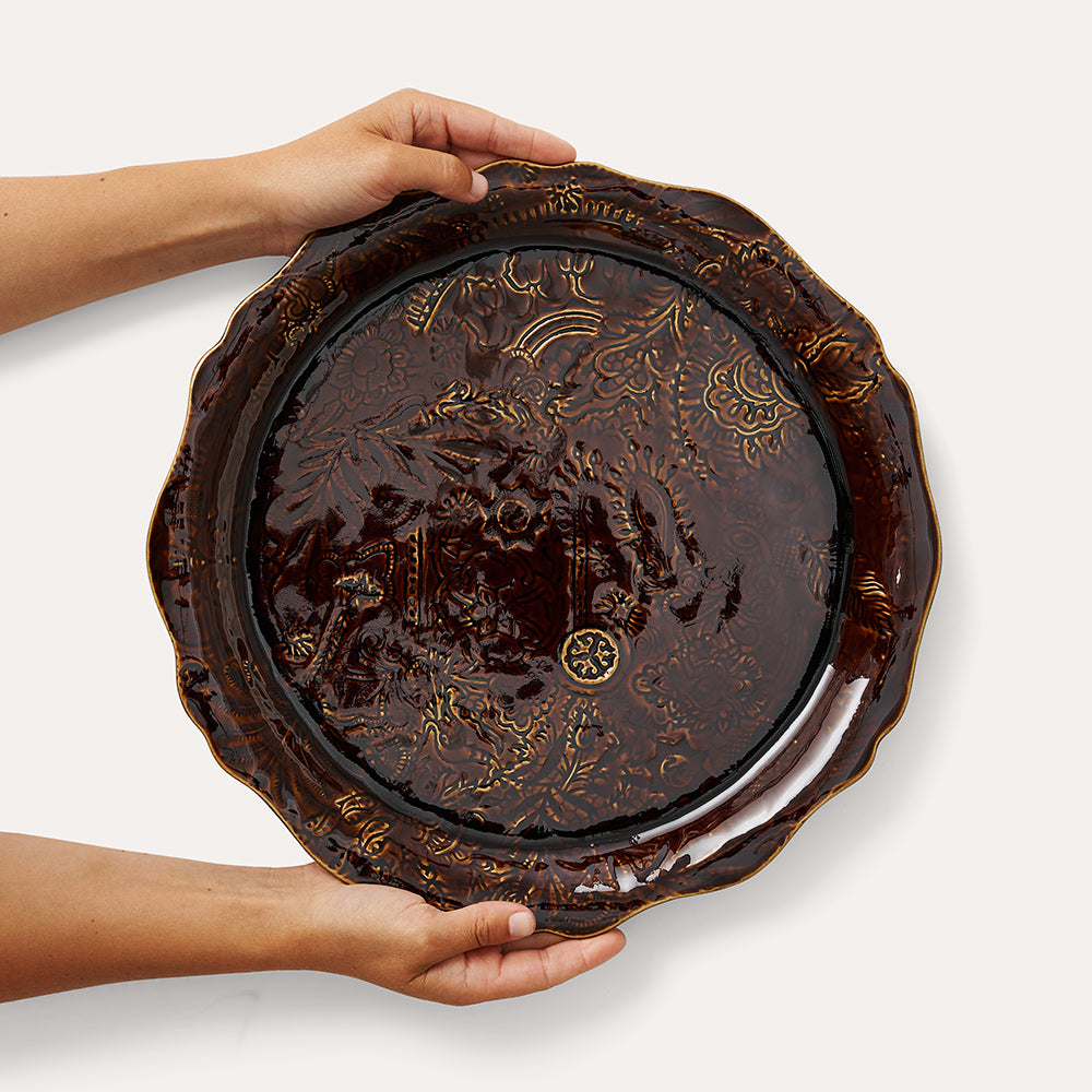 Det vakre serveringsfatet/ pizzafatet i Coffee kommer fra Sthål vakre serie Arabesque. Navnet arabesk kommer fra fransk og betyr arabisk. Det er også et spesielt kunstnerisk uttrykk med sløyfemønstre av planter, blader og bekker. Alle delene er produsert i hvitt steingods leire som er brent ved veldig høy temperatur, slik at keramikken blir holdbar. De vakre glasurene er nøye valgt for å få maten til å se appetittvekkende ut.