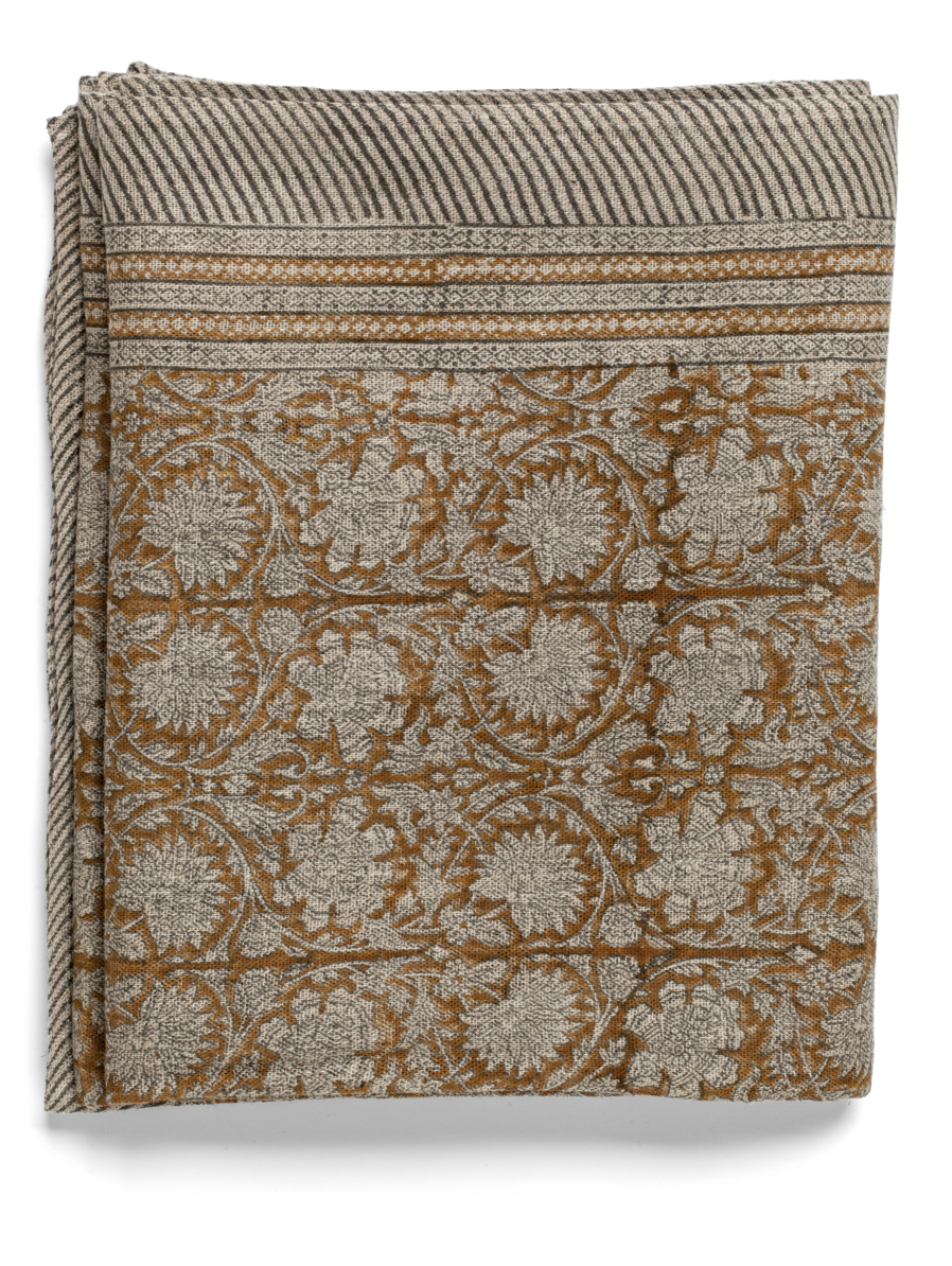 Vakker mønstret duk Paradise Ochre i 100 % lin fra populære Chamois. Duken er håndtrykt i tradisjonell indisk blokktrykkteknikk. Den håndlagede teknikken gir mønsteret et levende og dekorativt uttrykk. Blokktrykk er et unikt håndverk som gir vakre duker som er like pene inne som ute.