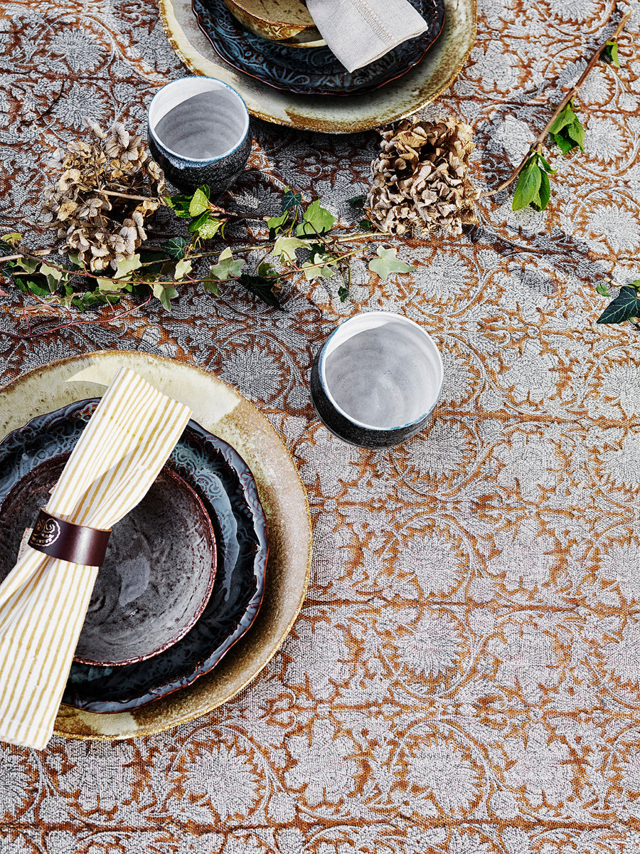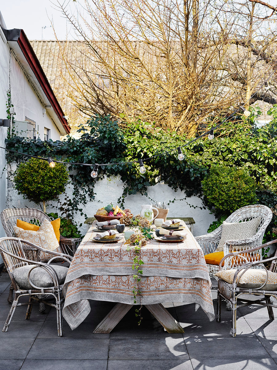 Vakker mønstret duk Paradise Ochre i 100 % lin fra populære Chamois. Duken er håndtrykt i tradisjonell indisk blokktrykkteknikk. Den håndlagede teknikken gir mønsteret et levende og dekorativt uttrykk. Blokktrykk er et unikt håndverk som gir vakre duker som er like pene inne som ute.