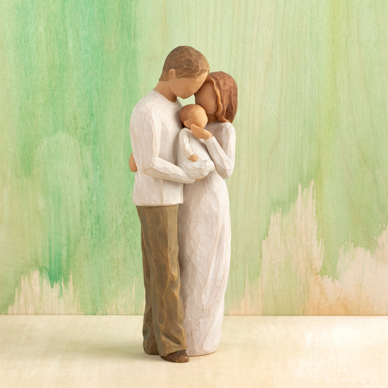 Figur av stående par som holder babyen mellom seg. Kvinne i kremfarget kjole og mann i kremfarget skjorte og mørke bukser; baby i kremfarget onesie.
