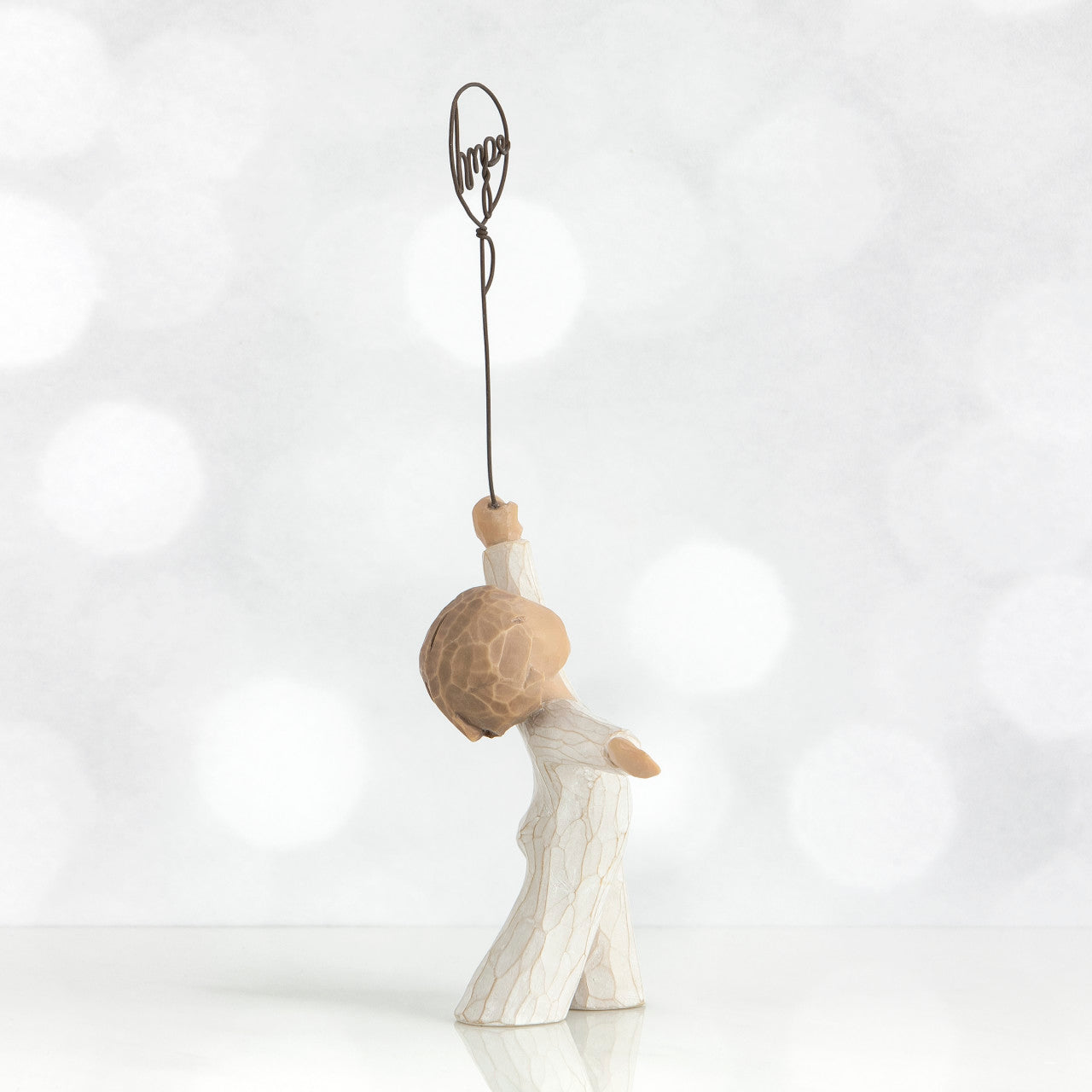 Figuren Hope fra Willowtree kommer i fin gaveeske med teksten «Håp løfter oss!» En gave for å støtte og oppmuntre håp og helbredelse.