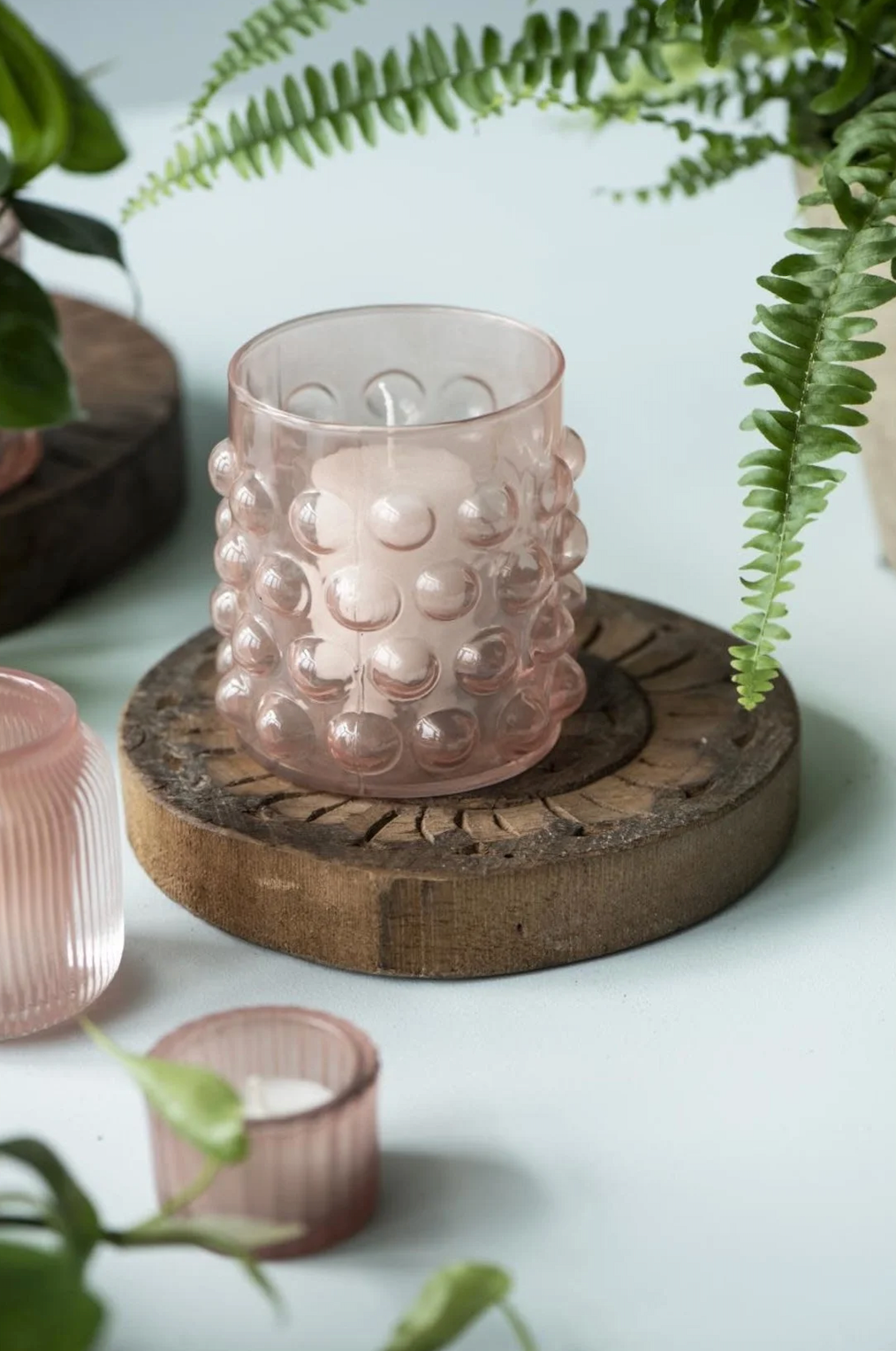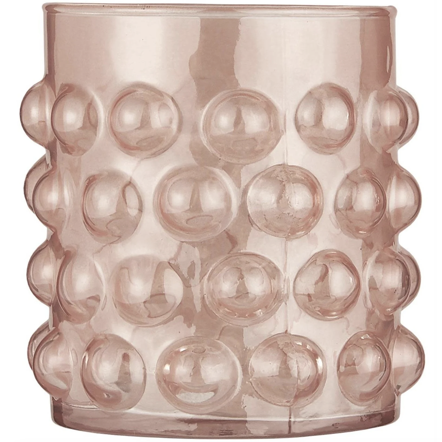 Vakker telysholder i glass med bobler. Kommer i en nydelig støvrosa farge. Lyslykten måler H10 x B8,5cm.
