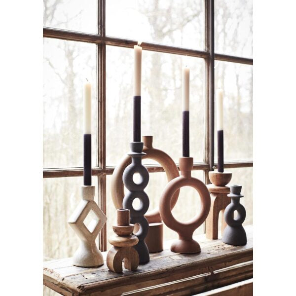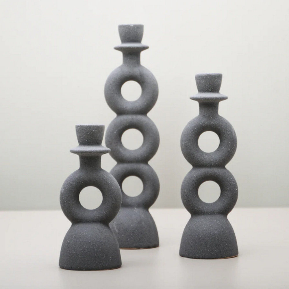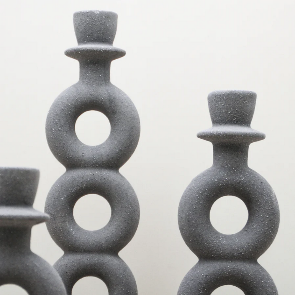 Lysestake i rustikk mørk grå keramikk fra Madam Stoltz med trendy runde former. Lysestaken har tre ringer med en matt og ru overflate.