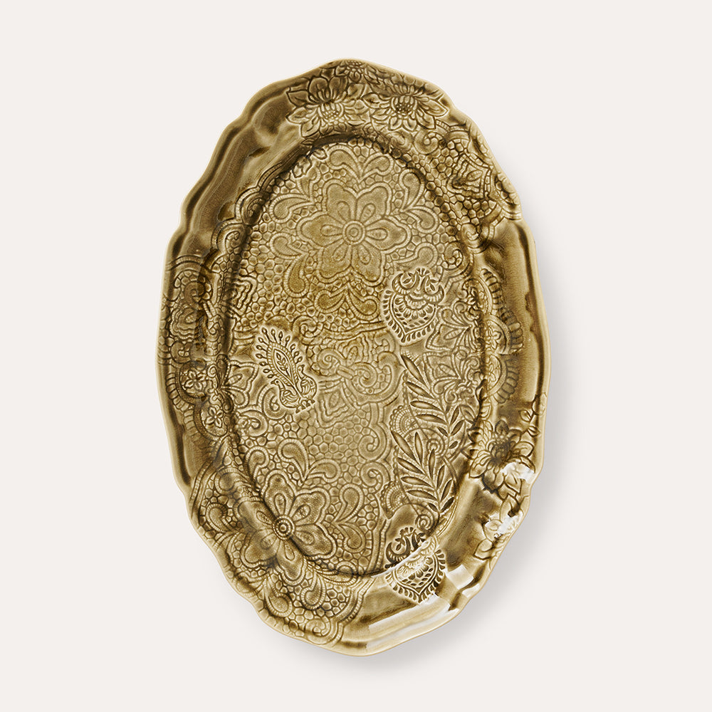 Det vakre serveringsfatet kommer fra Sthåls vakre serie Arabesque. Navnet arabesk kommer fra fransk og betyr arabisk. Det er også et spesielt kunstnerisk uttrykk med sløyfemønstre av planter, blader og bekker. Alle delene er produsert i hvitt steingods leire som er brent ved veldig høy temperatur, slik at keramikken blir holdbar. De vakre glasurene er nøye valgt for å få maten til å se appetittvekkende ut.