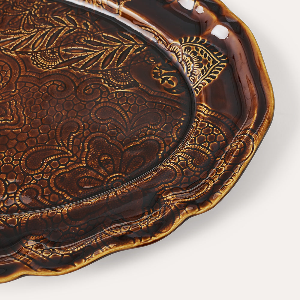 Det vakre serveringsfatet kommer fra Sthåls vakre serie Arabesque. Navnet arabesk kommer fra fransk og betyr arabisk. Det er også et spesielt kunstnerisk uttrykk med sløyfemønstre av planter, blader og bekker. Alle delene er produsert i hvitt steingods leire som er brent ved veldig høy temperatur, slik at keramikken blir holdbar. De vakre glasurene er nøye valgt for å få maten til å se appetittvekkende ut.