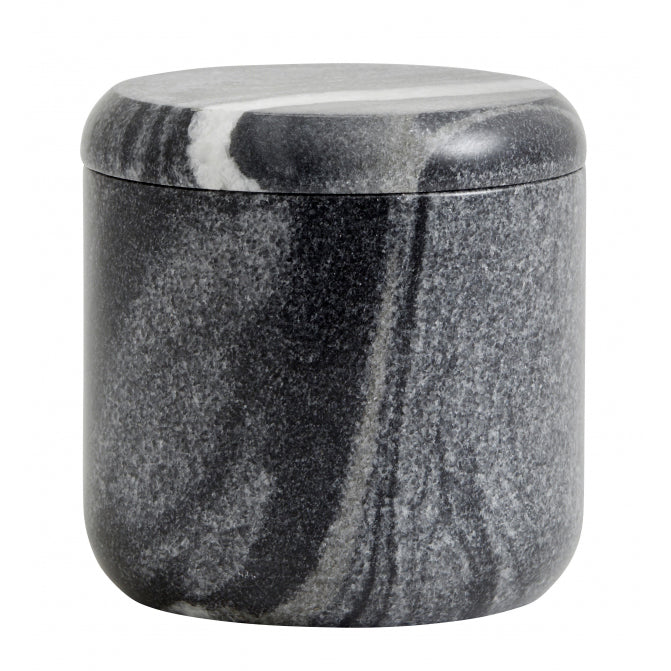 Polert marmor boks med lokk fra Nordal. Boken har naturlig marmorering og avrundede kanter.