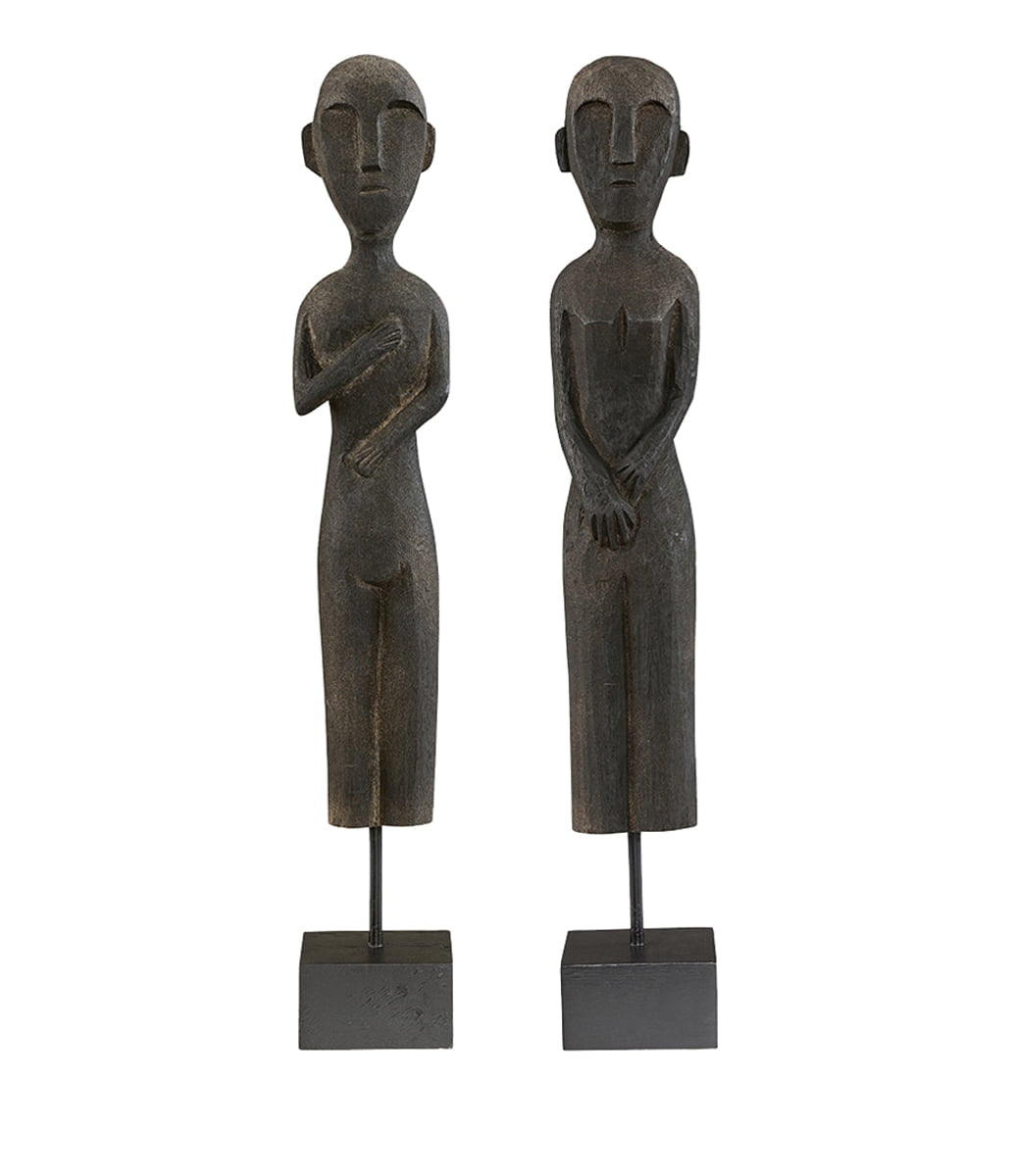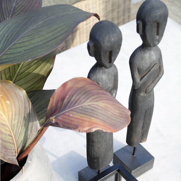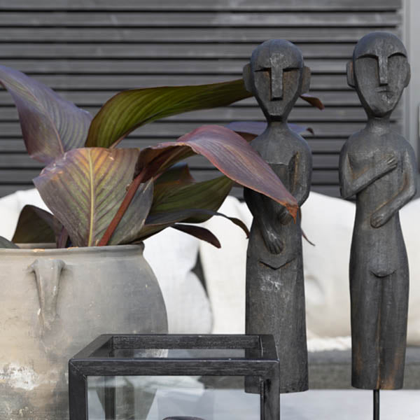 En elegant trestatue som viser en mann eller en kvinne. Laget av antikkbehandlet svart mangotre og montert på solide føtter, kombinerer denne statuen en rustikk sjarm med moderne eleganse. Hver statue er unik og gir et kunstnerisk preg til både moderne og klassiske hjem.