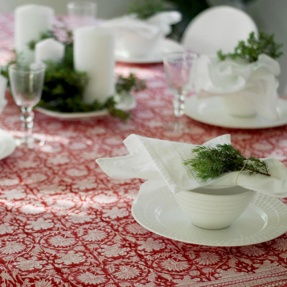 Vakker mønstret duk Paradise i 100 % bomull fra svenske Chamois. Duken er håndtrykt i tradisjonell indisk blokktrykkteknikk. Den håndlagede teknikken gir mønsteret et levende og dekorativt uttrykk. Blokktrykk er et unikt håndverk som gir vakre duker som er like pene inne som ute.