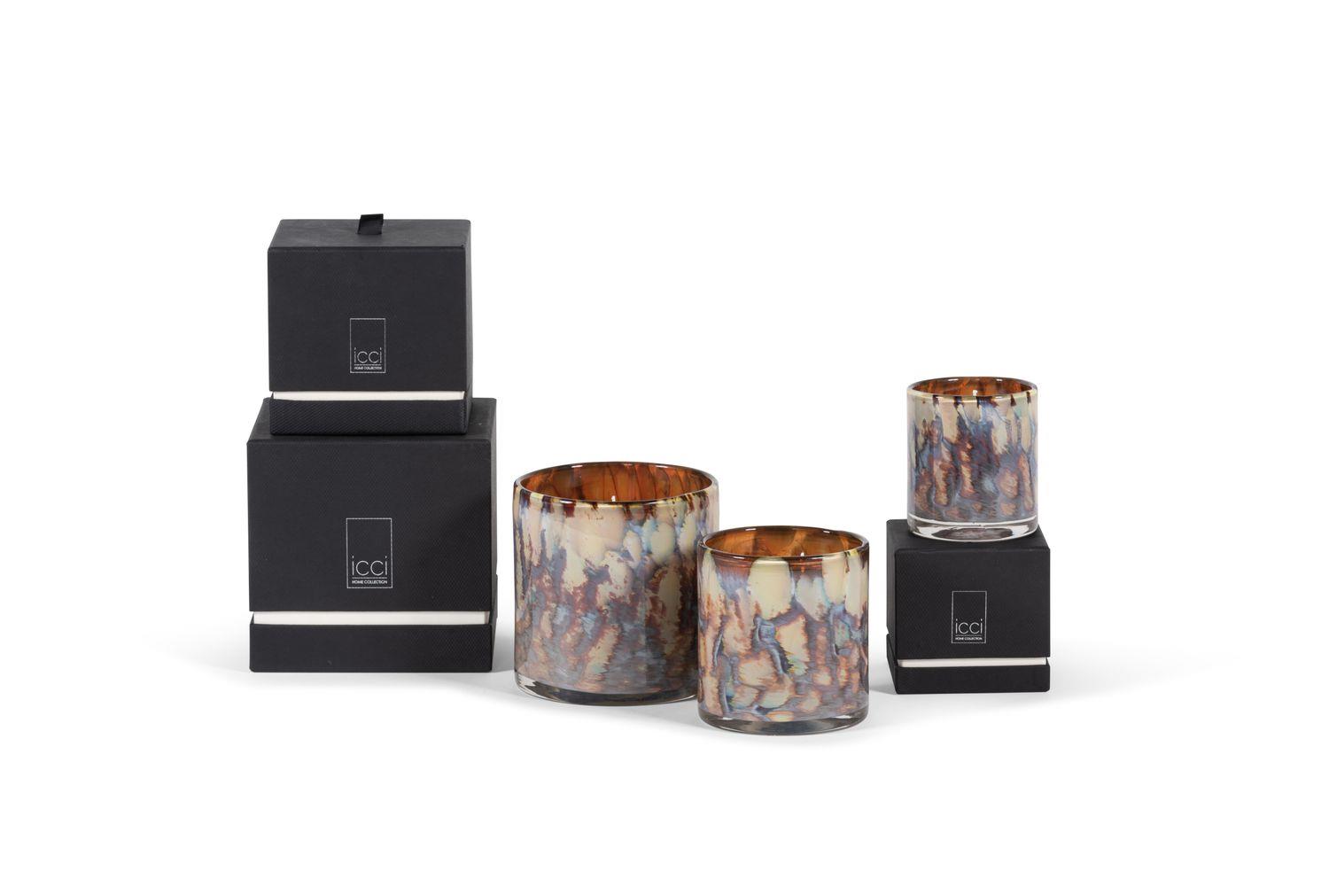Den unike vasen er munnglåst i glass og kommer fra Dekocandle. Vasen har et bark design og er flerfarget med grønn og rav farger.