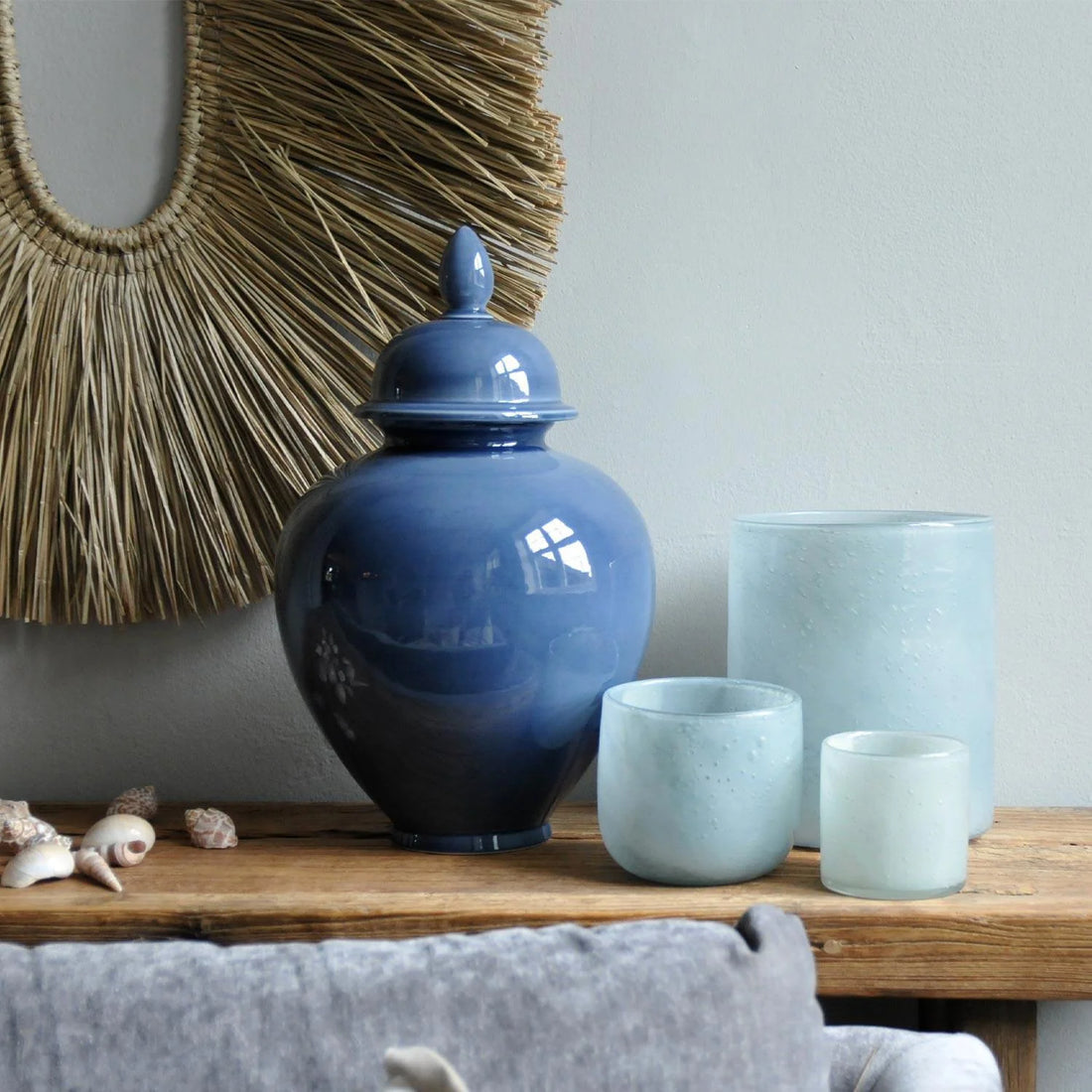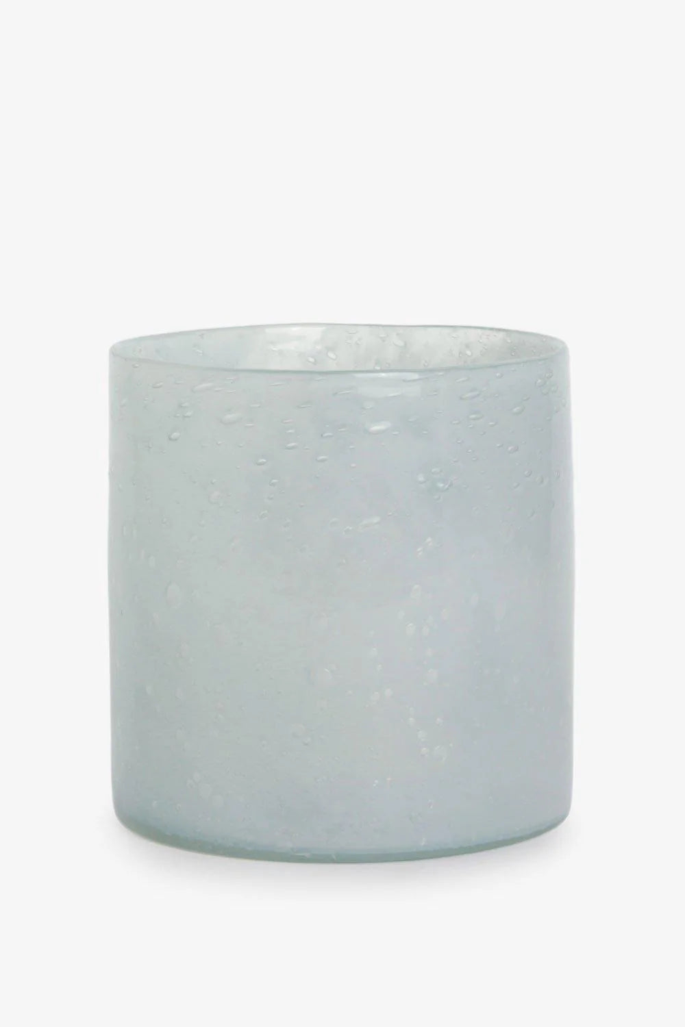 Håndlaget vase/lyslykt fra Lama i en delikat blågrå farge. Det unike fargespillet i glasset oppstår når fargepigmentet tilføres og glasset formes til sin endelige fasong. Hvert produkt vil derfor ha sitt eget individuelle uttrykk. Den uregelmessige pigmenteringen gjør samtidig at lykten kaster et lunt og vakkert lys i rommet.