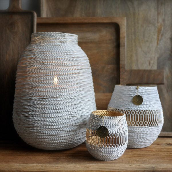Unik lyslykt Tråd fra Lama i hvitt og gull designet av Aina Sollie Sten for Lama. Disse populære lyktene passer like fint ute i hagen/ hagestuen som inne.