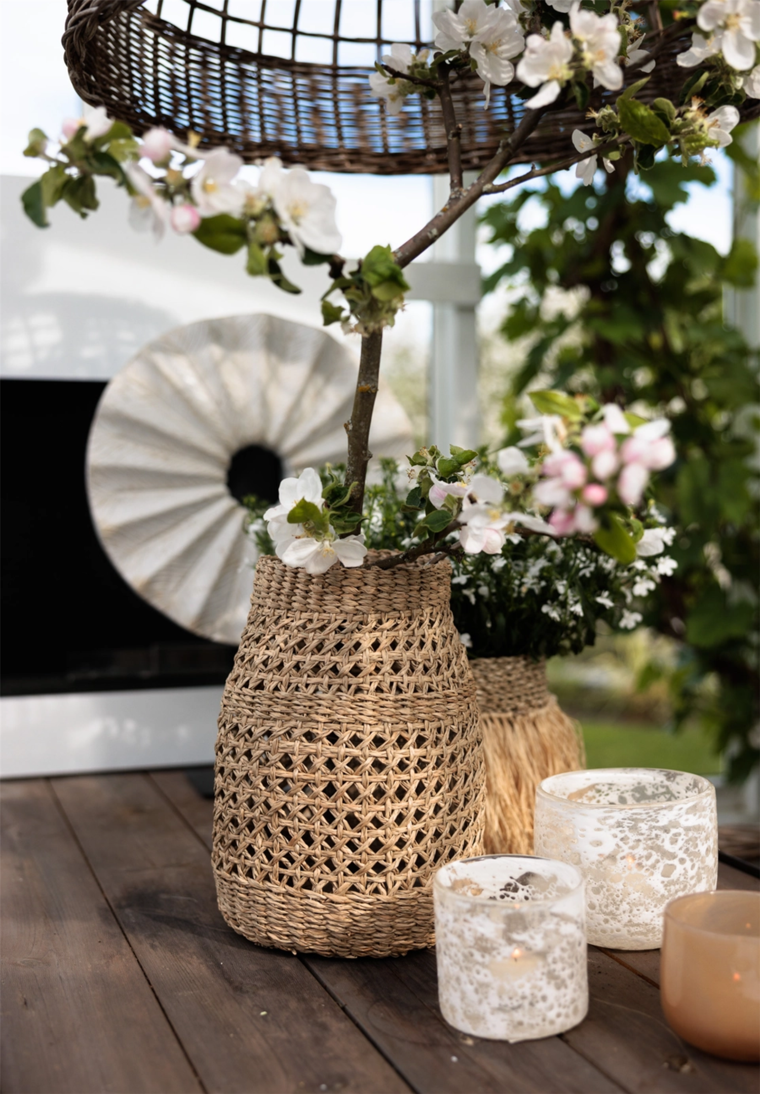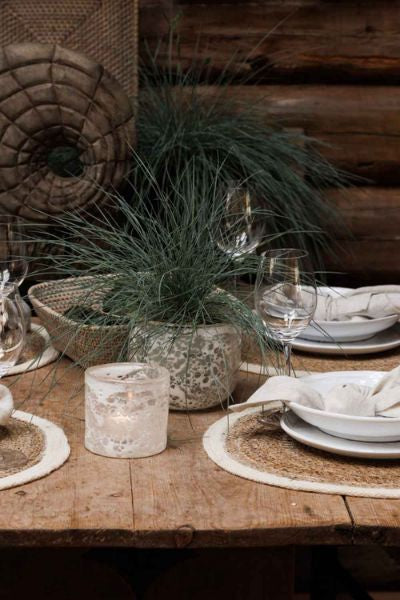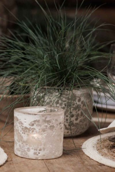 Telysholder med glasert glass fra Lama på 10x10 cm i en vakker blanding av klart og hvitt glass i et dekorativt mønster som minner om bobler fra såpeskum eller bølger som bryter. Glasset er gjennomfarget og lysholderen kan derfor også fint brukes som en liten vase.